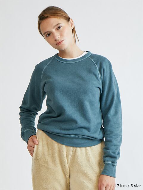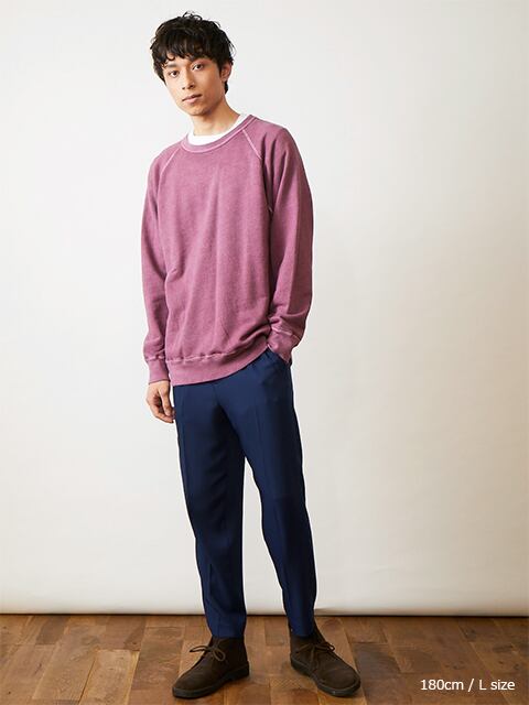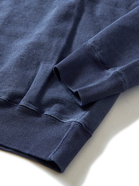 スウェット特有の生地やステッチの凹凸に色の濃淡が際立つPigment Dye(顔料染め)カラーは他にはない味のある表情が特徴で、洗濯の度に表面から徐々に色褪せしさらに風合いを増していくので、長く愛用するほどに上質なビンテージ品のように印象が変わっていきます。