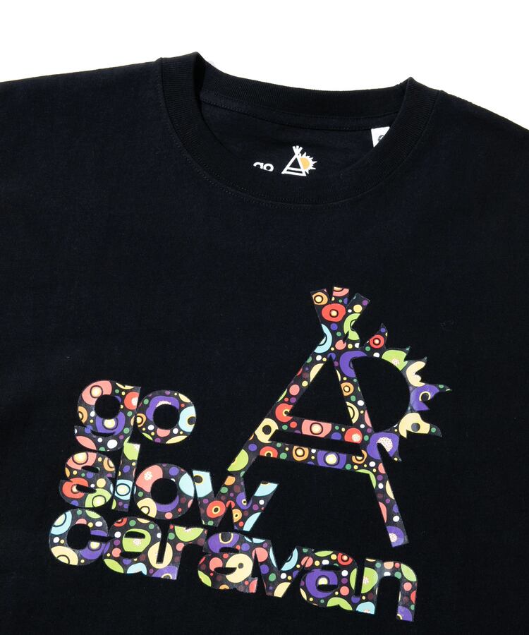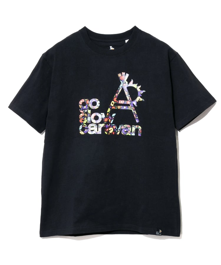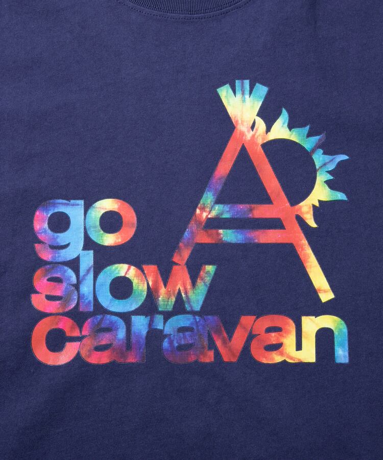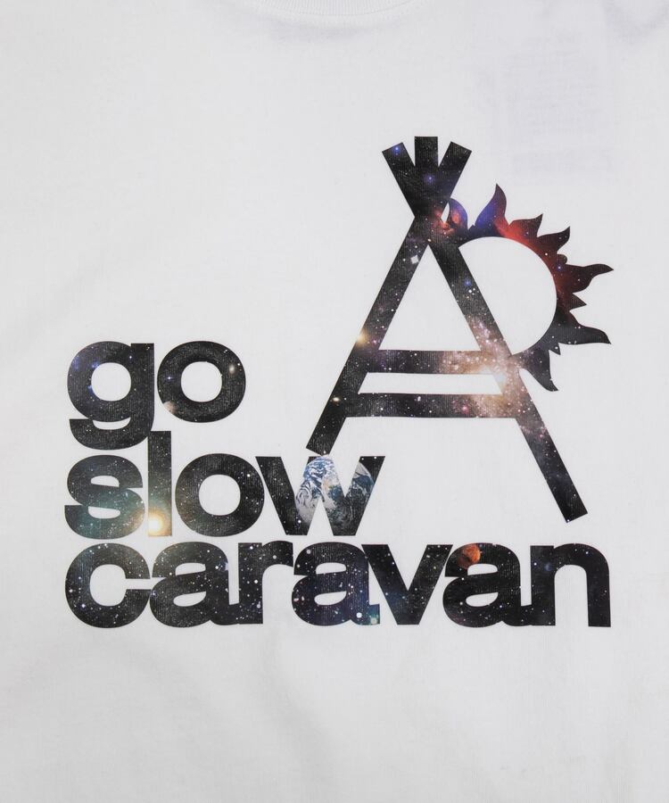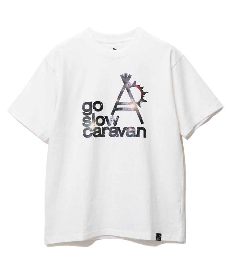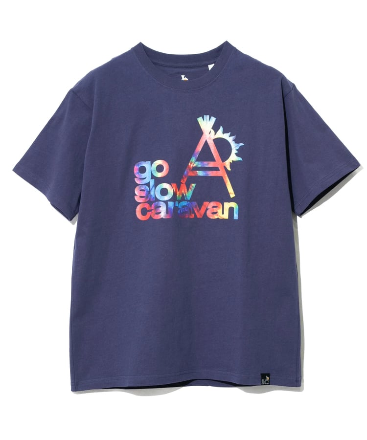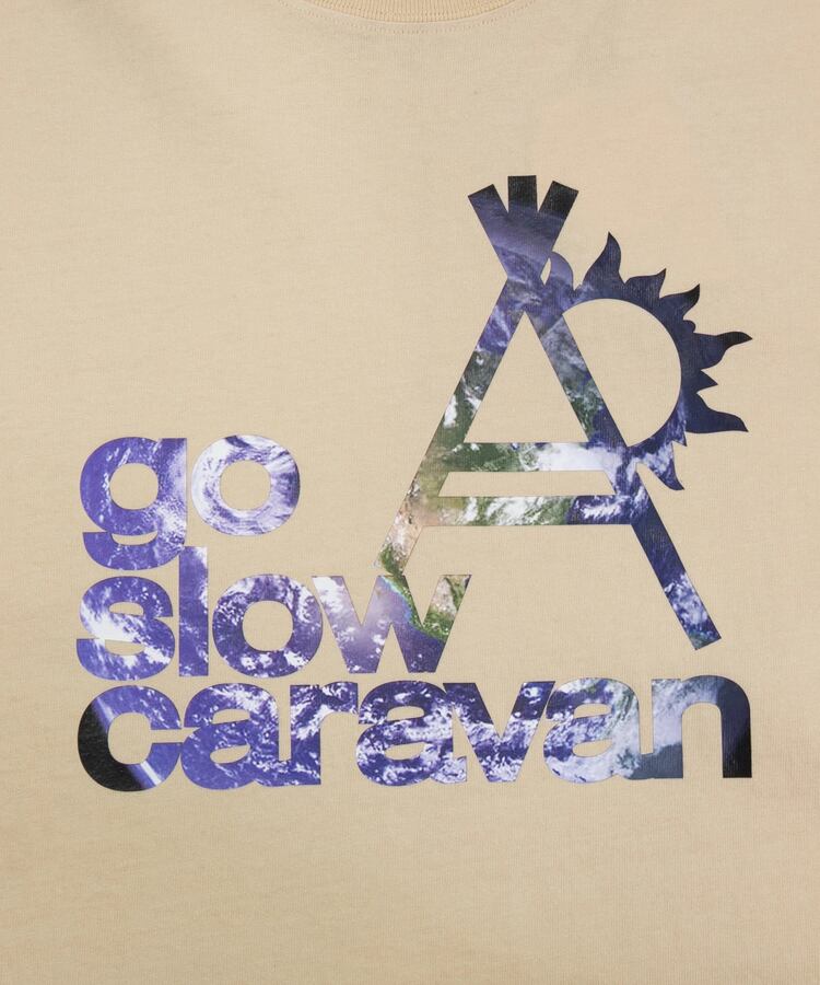 go slow caravanオリジナルの柄をブランドロゴの形にカッティングした、発色のいいシートプリントのロゴTEE。