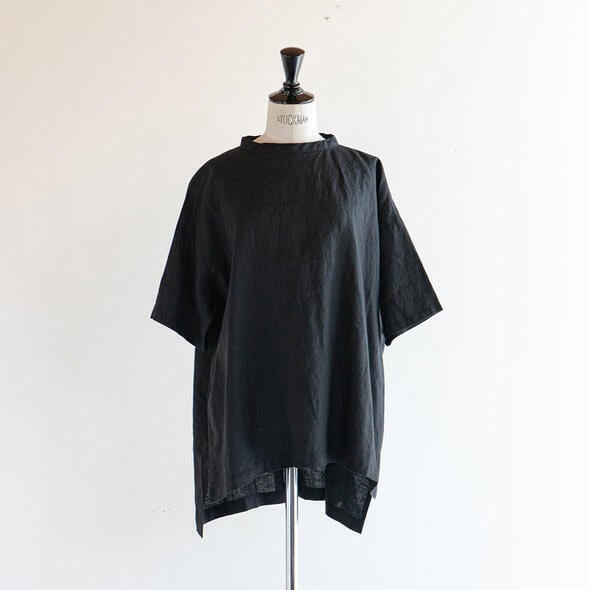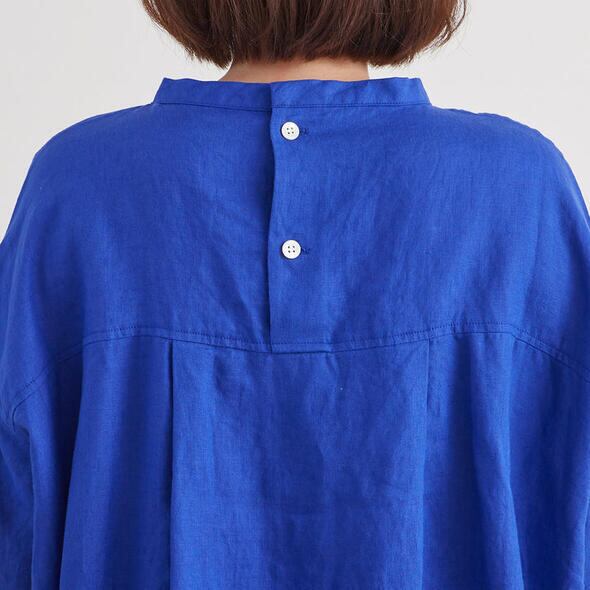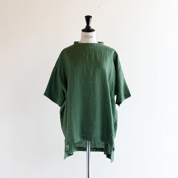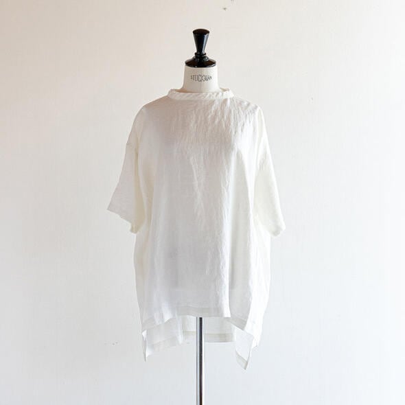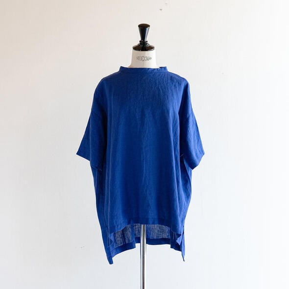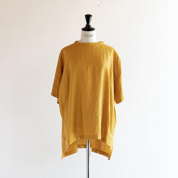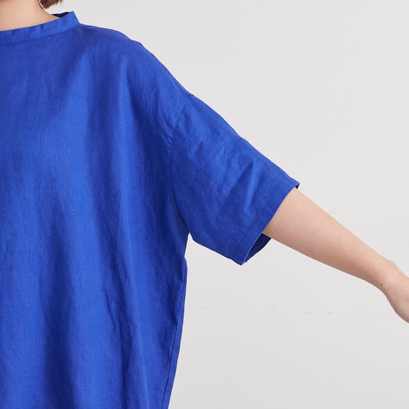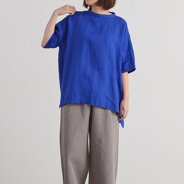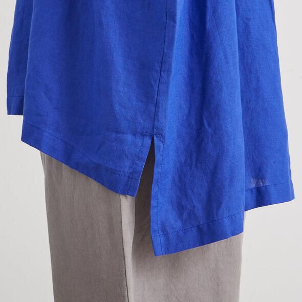 昨年好評だった68/75リネン100%のプルオーバーです。バックにはボタンが施され、バックスタイルも可愛いデザインに。ワイドなシルエットなので着心地もゆったりとしています。また前後で異なる丈の長さやスリットもポイント。おしりがすっぽり隠れる着丈でパンツからスカートまでボトム選びに困らないので、多彩なコーディネートが楽しめます。