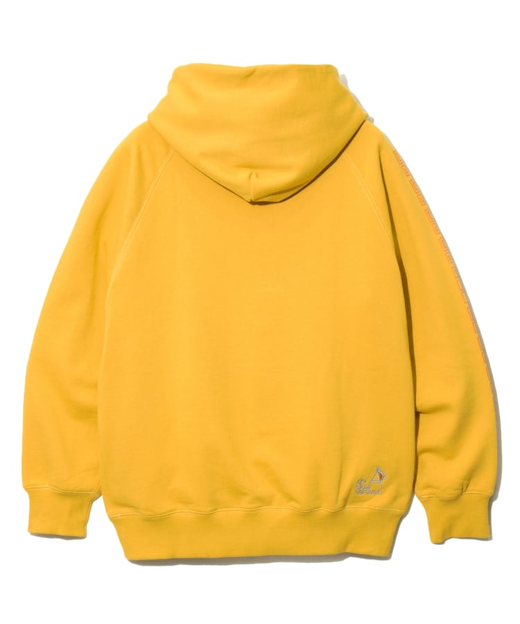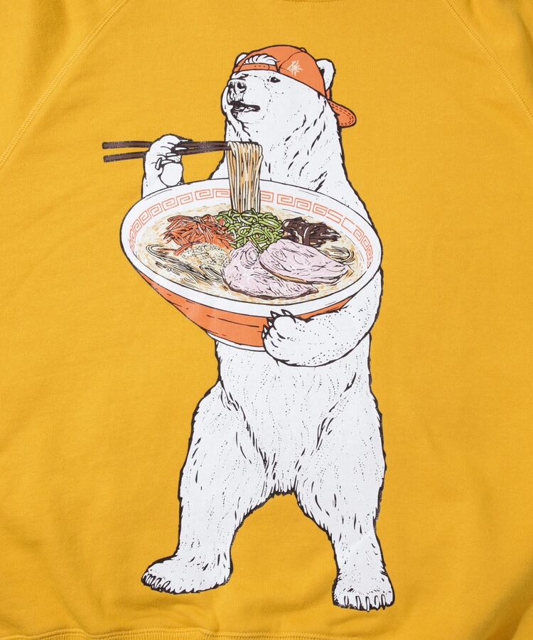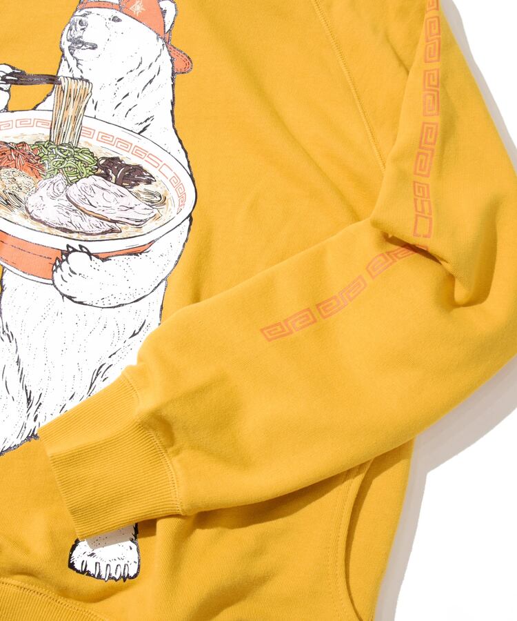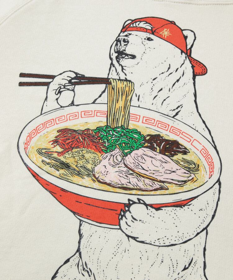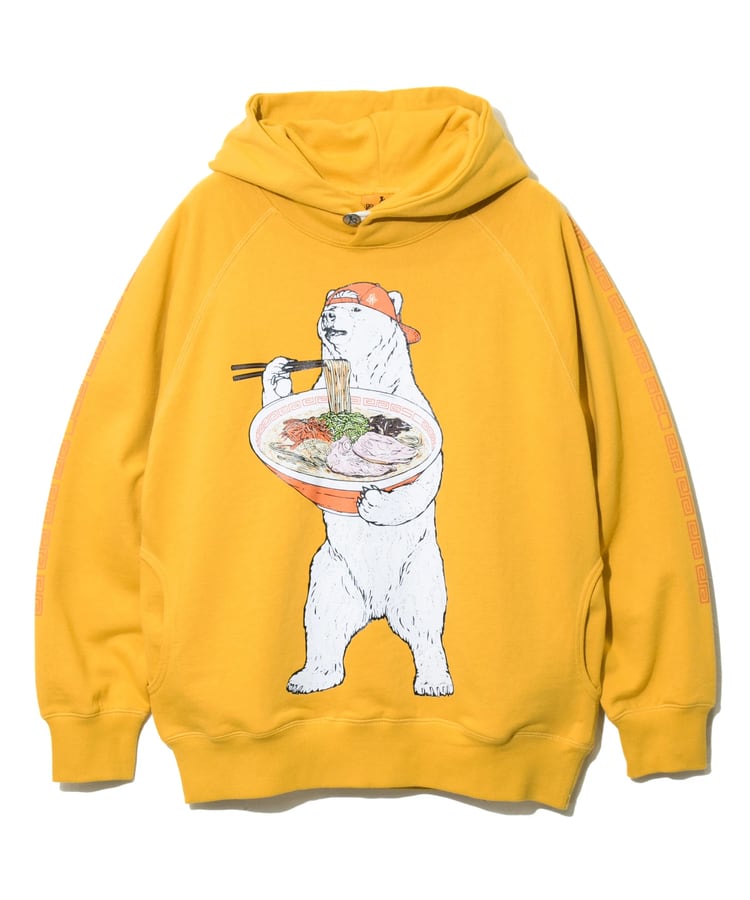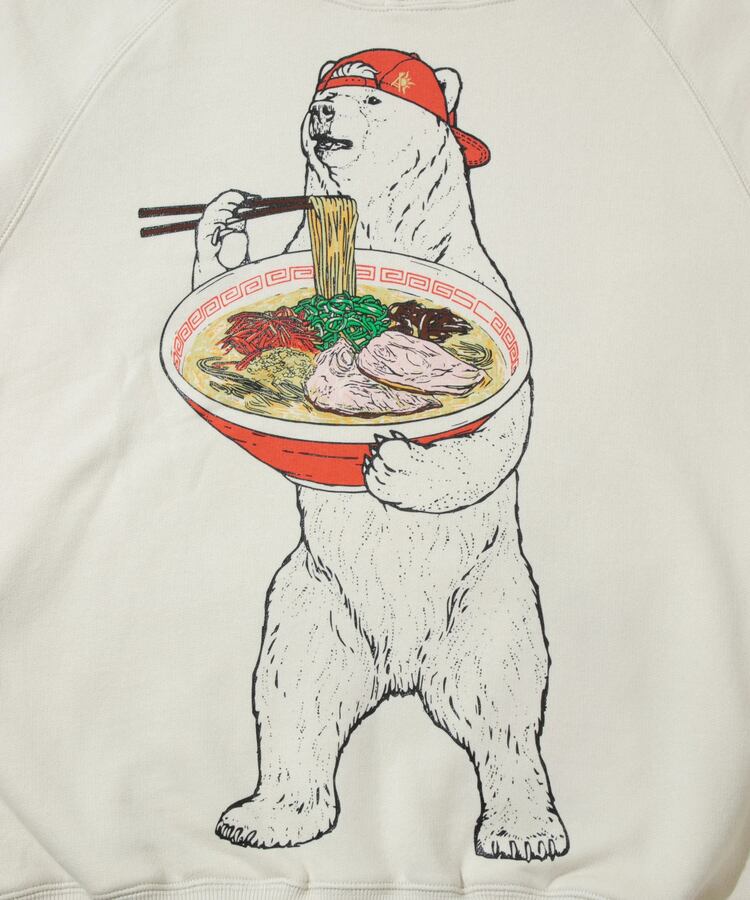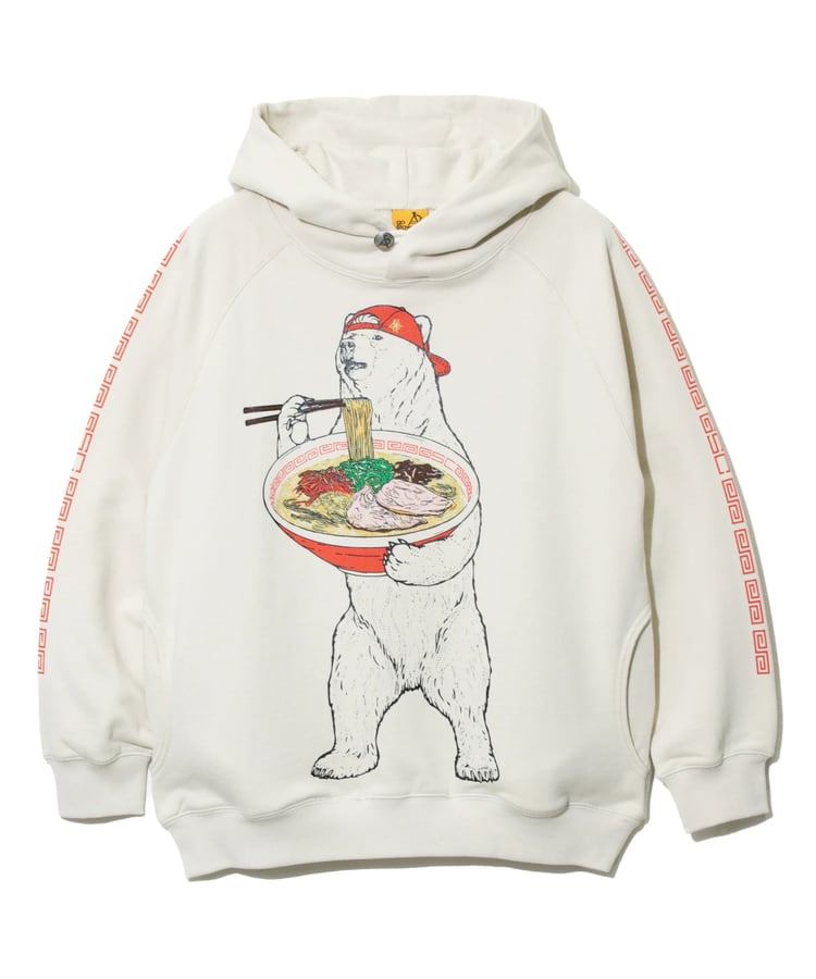 白濁スープに色鮮やかな具材が食欲をそそる豚骨ラーメン。黒インク部分は立体感のあるジェルプリントをのせた多色版プリント。袖にはラーメン丼でお馴染みの雷文のラインプリント。サイドポケット付きラグランプルパーカー。バックサイドにはLOGO刺繡入り。