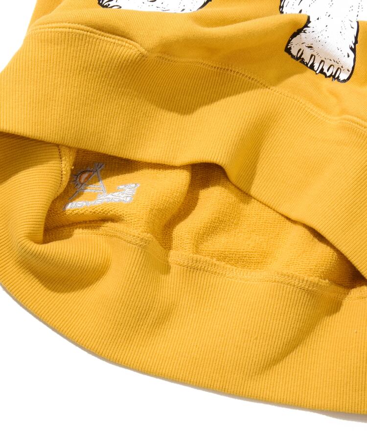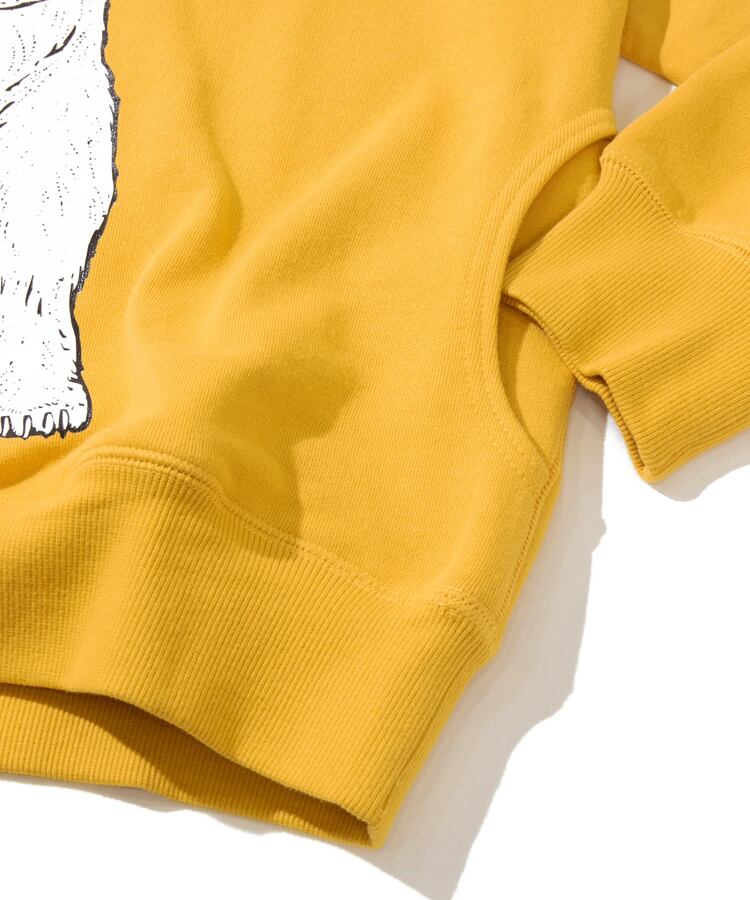 綿100%ヘビーウェイトの裏毛生地。表は空紡糸らしいガシッとした肌触りでありながら、裏のパイル面には太い裏糸を使用しているので空気を多く含みフワッと柔らかい着心地を実現。使い込むほどに風合いの増す生地。クラシック感のある長めのリブや3本針で丈夫な縫製などこだわりのディテールも取り入れた長くご愛用いただけるアイテム達です。