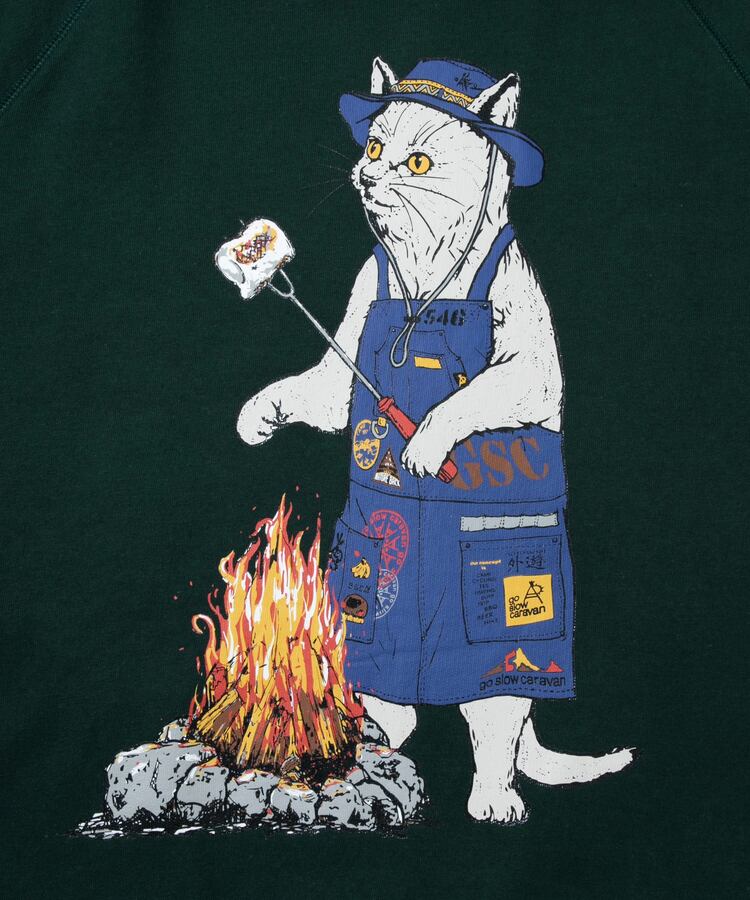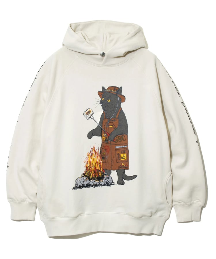 細部まで描きこんだ焚き火でソーセージを焼くクマとマシュマロを焼く猫の焚火アニマルのキャンプにピッタリなプリントプルパーカー。