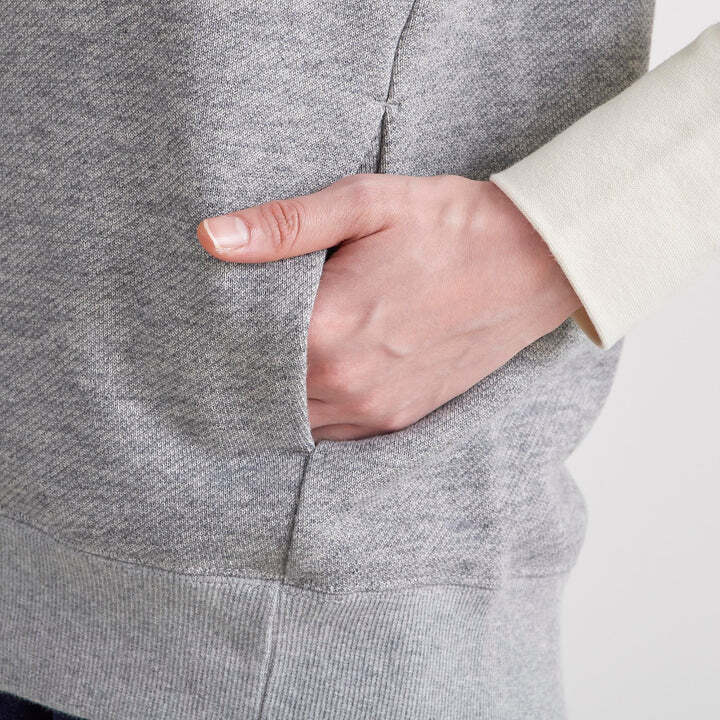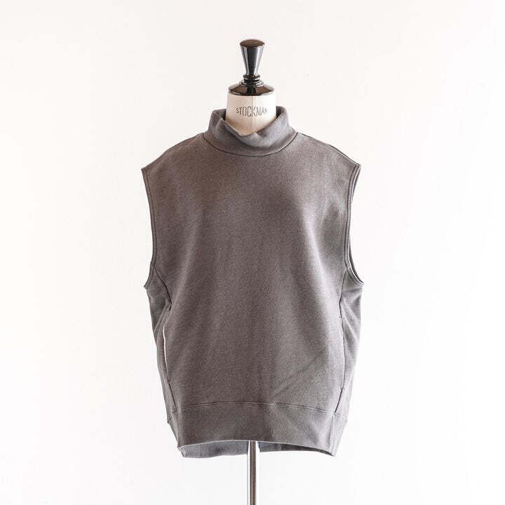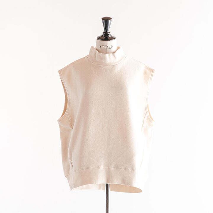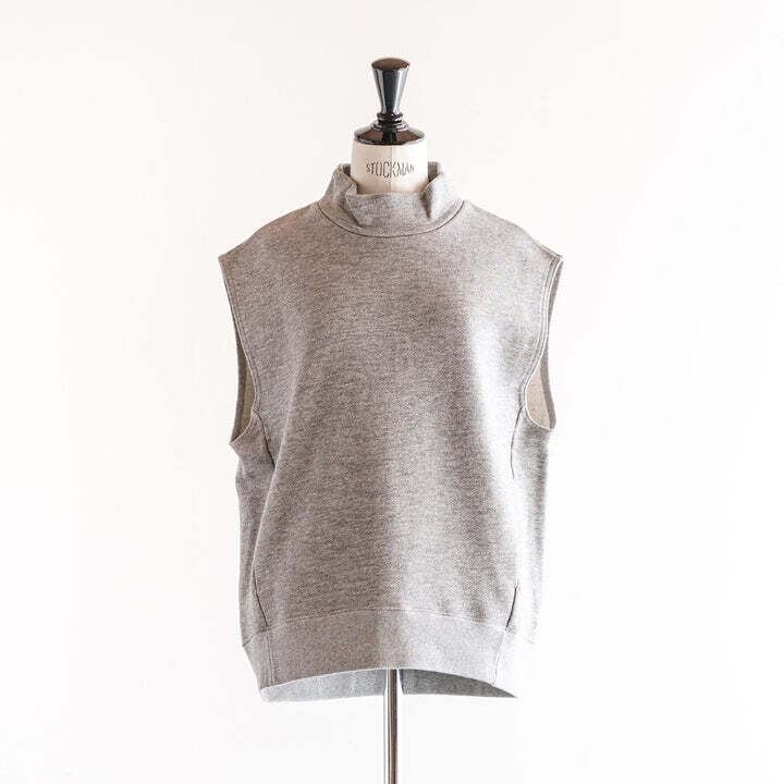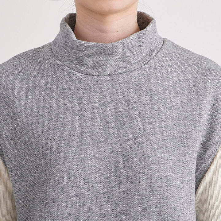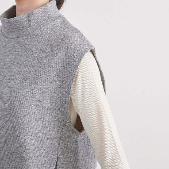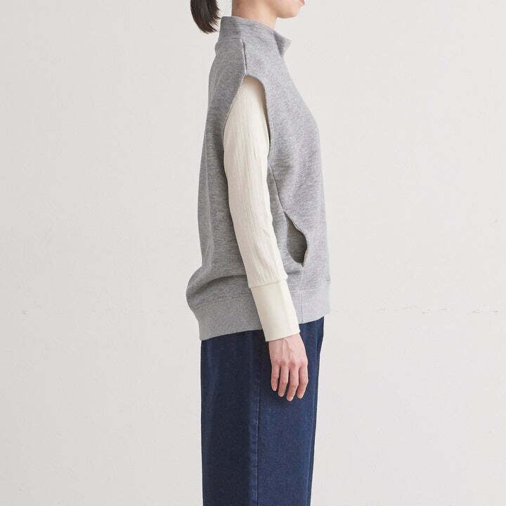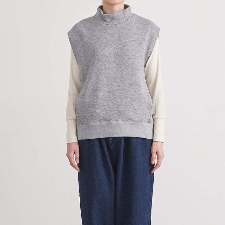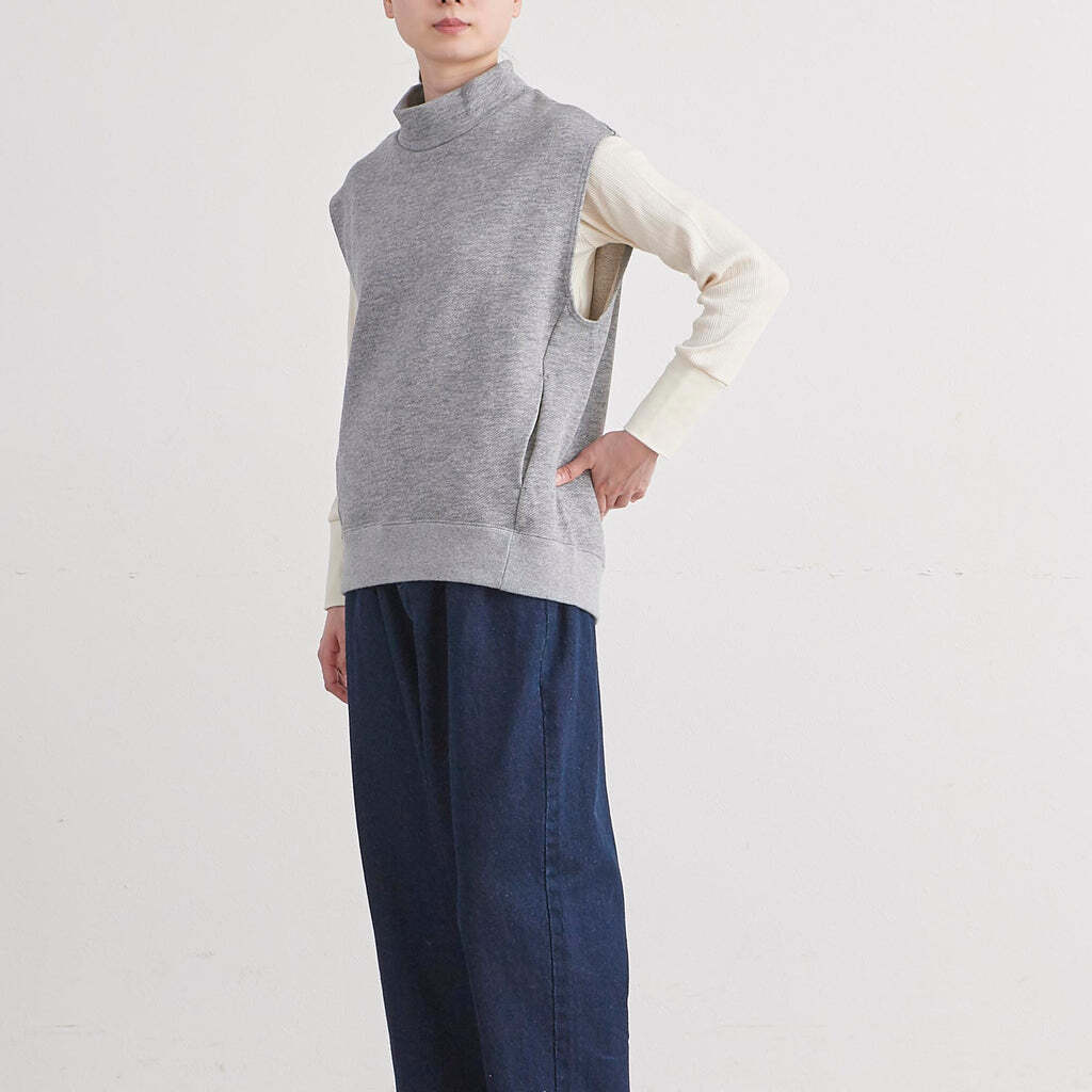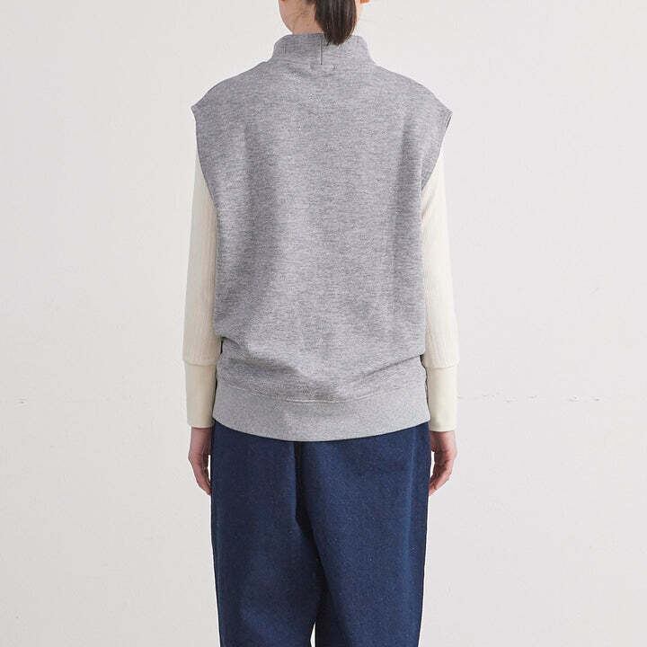 綿100%の厚手の裏毛ベストで秋冬らしいレイヤード使いにおすすめのアイテムです。カジュアルに見えがちな裏毛素材でもハイネックの仕様にすることでカジュアル過ぎないようにしています。アームホール・襟元はゆるめの作りのため、インナーを合わせてもノンストレスで着用していただけます。前身頃を斜めに切り替えてポケットを付けているので、デザイン性のみでなく体のシルエットを細見えさせるのも嬉しいポイントです。