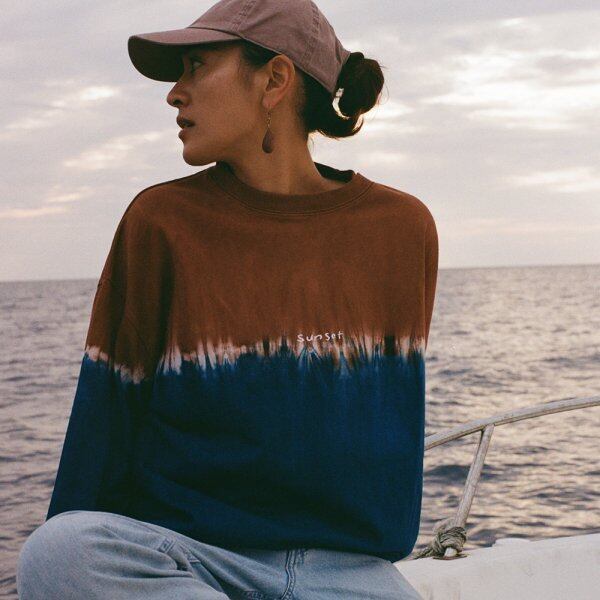 また、デザイナーは奄美大島で素潜り漁やガイドなどアウトドア全般を行い、そこから得るインスピレーションを基にブランドでデザインに落とし込んでいるということです。泥染め、藍染め、藍泥染め、テーチ木染めの4色から織りなす染めの柄は奄美大島の大自然を体現した作品でもあると言えます。