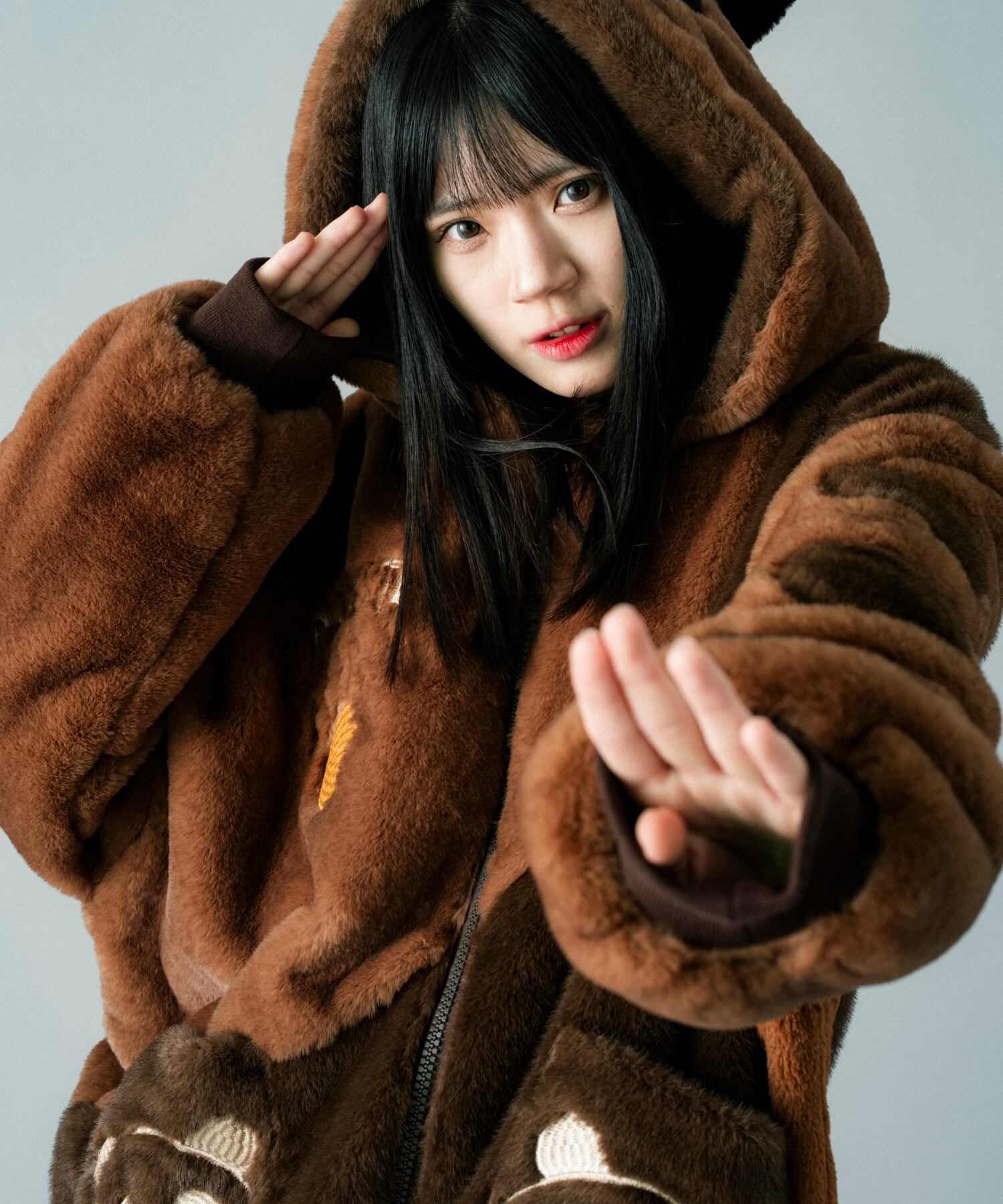 毛足の短いフェイクファー素材がインパクトのあるフルジップパーカーをデザインしました。