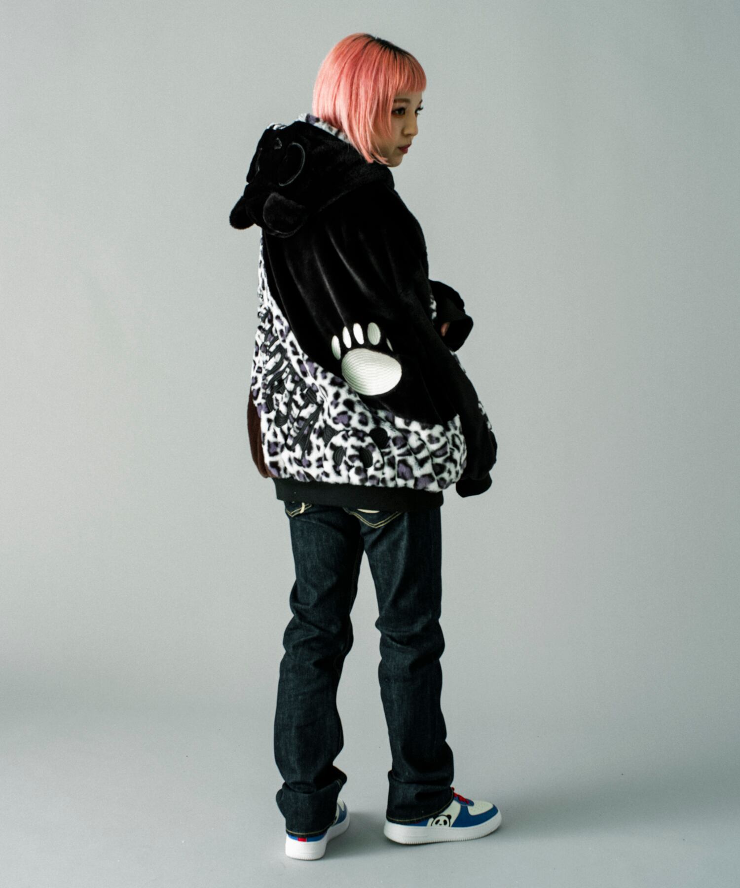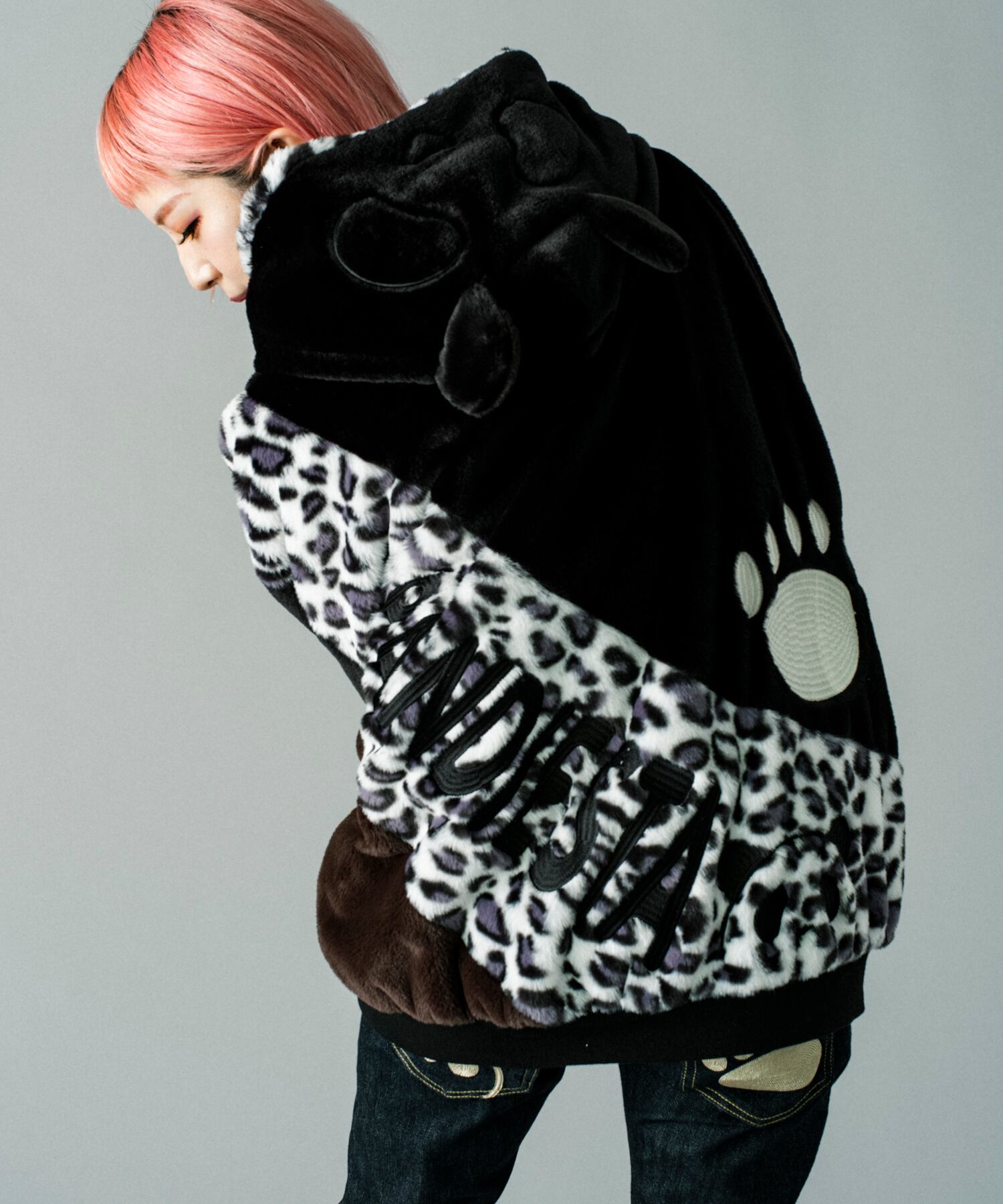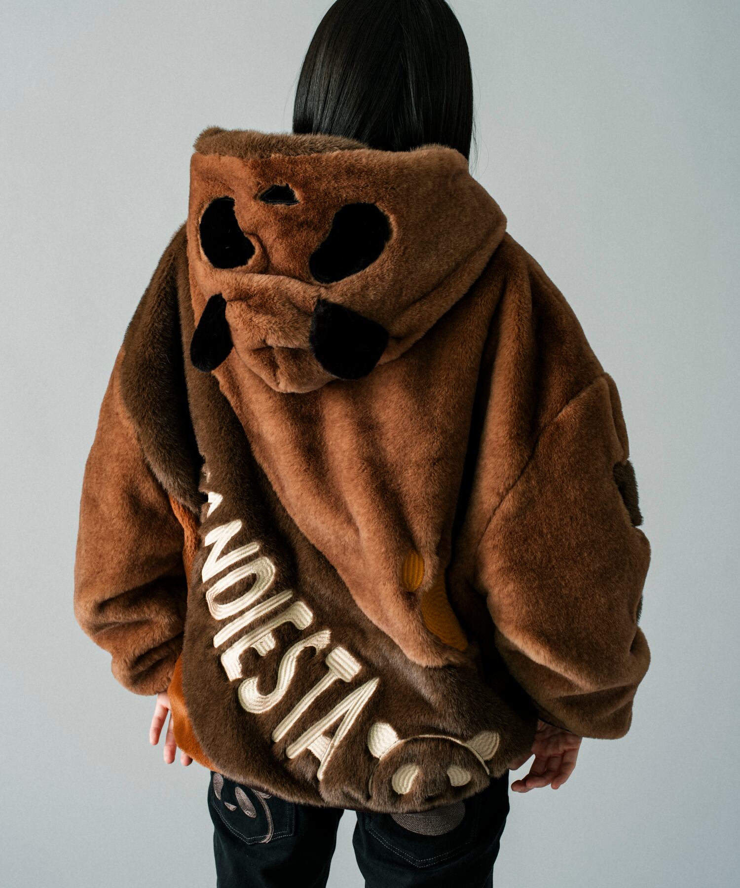 毎シーズン人気のフェイクファーパーカーが今年も登場しました。各カラー共に雰囲気の異なるフェイクファーを肩口から裾に向かってカーブを描いて切り替えており、袖にはパンダアイコンを配置しました。