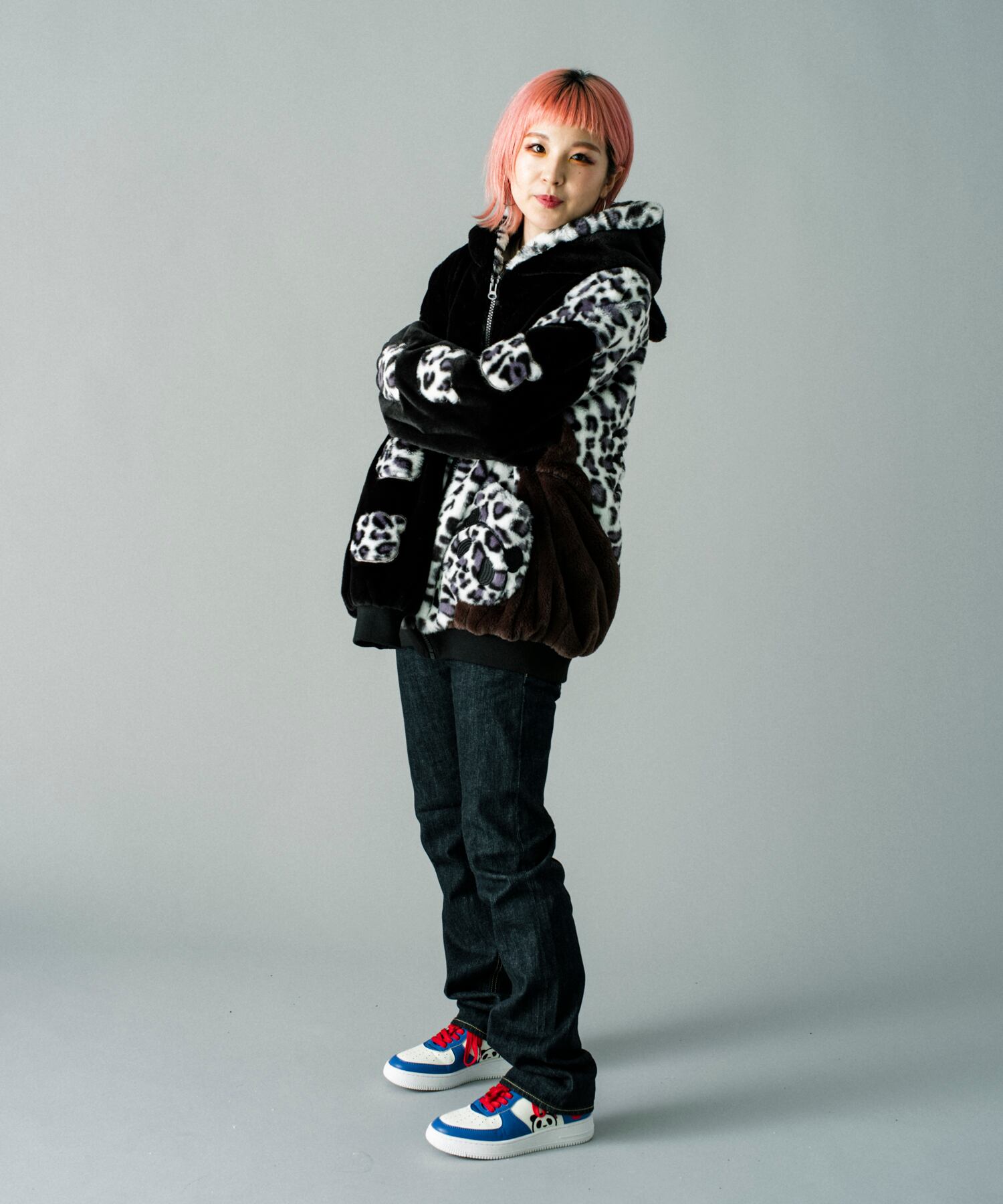 タイダイやヒョウ柄といった面白いカラーリングで随所を切り替え、ホワイト、ブラック、ブラウンの3カラーがラインナップ。どのカラーも人気で男女問わず、スタイリングいただけます。