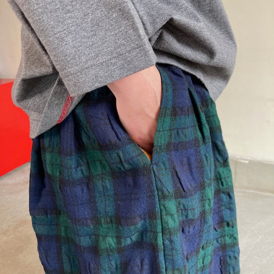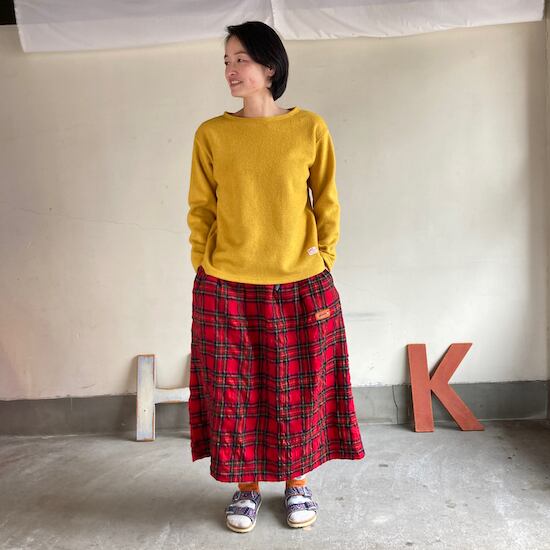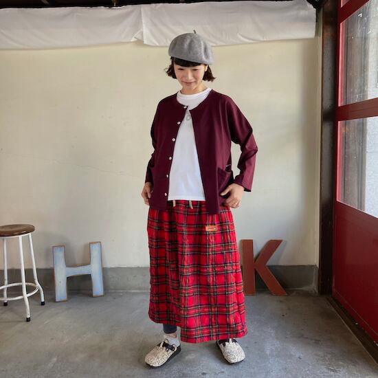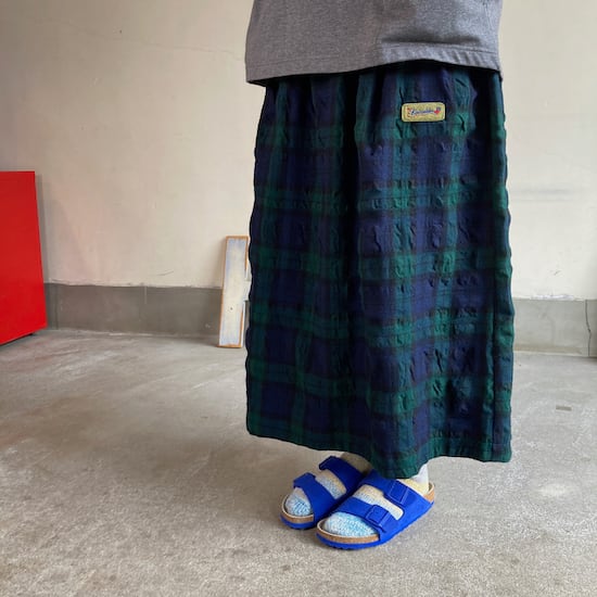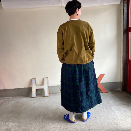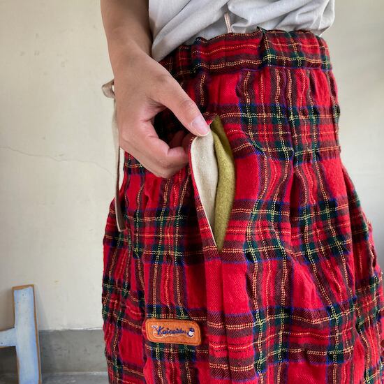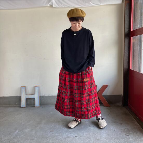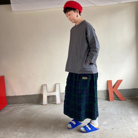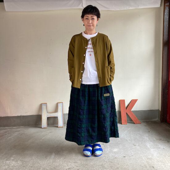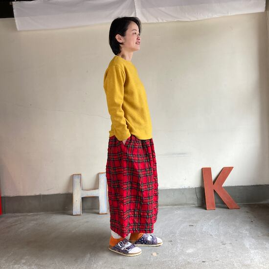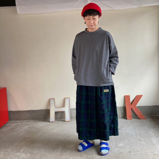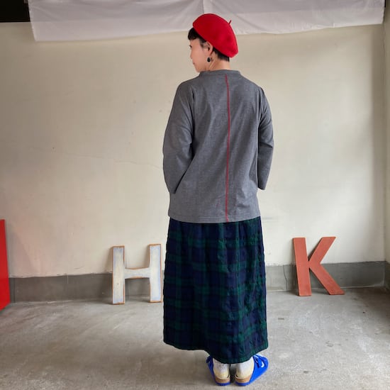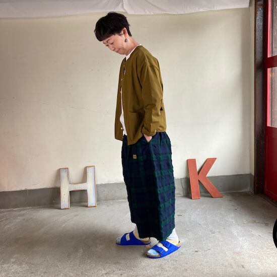 快晴堂のスカートの中でもふんわりゆったりとしたデザインです。ペインターなどのワークっぽい雰囲気の作品に比べて、レディース感があるかわいらしい雰囲気が素敵です。生地の説明でも触れましたが、ふんだんに生地を使いボリューム感があるにも関わらず、軽やかな着用感であるところもさすが!と思ってしまいますし、おすすめポイントです。