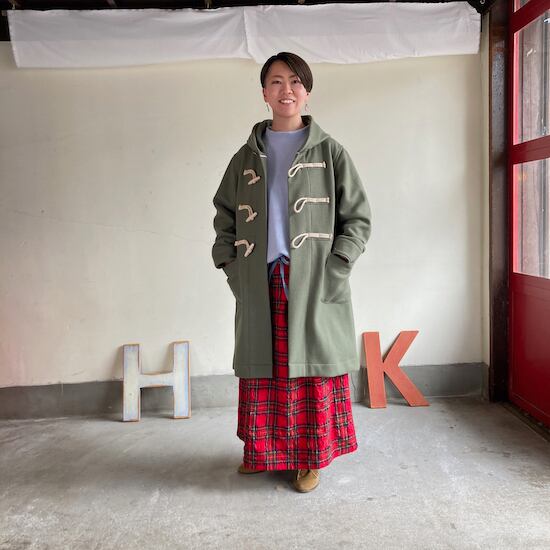 WoolとCottonの混率のバランスがベストな生地は軽い凹凸感と風合がより快晴堂らしくカジュアルな雰囲気になります。また、軽い生地なのでボリュームのあるデザインもストレスなく軽やかな着心地をお楽しみ頂けます。あたたかみのある生地ですので秋冬の着こなしに合わせやすい素材感です。