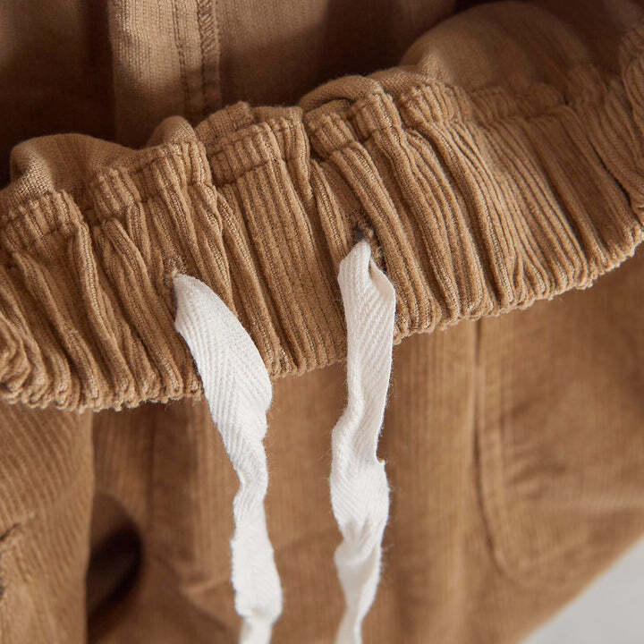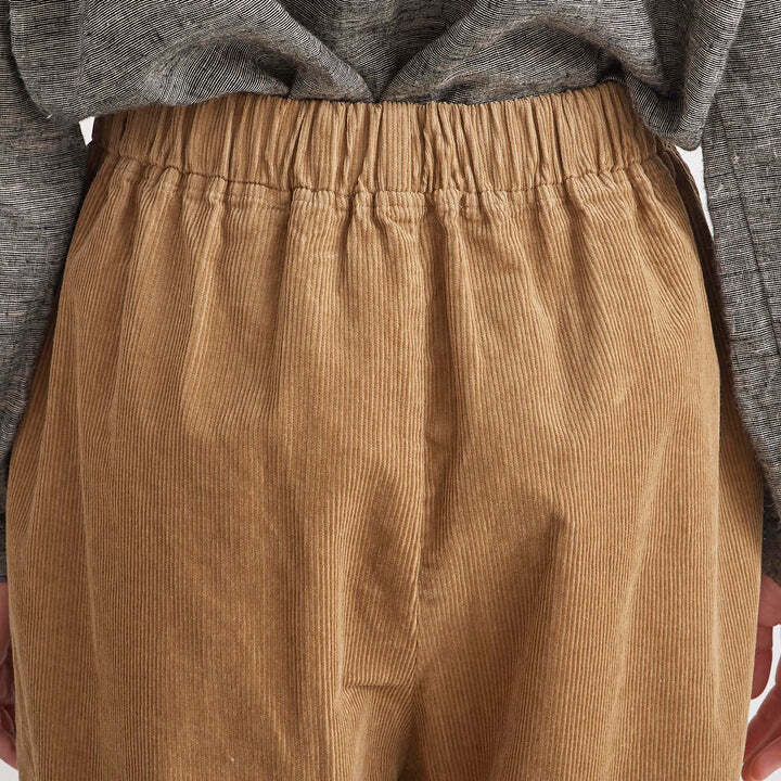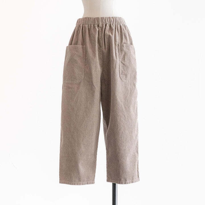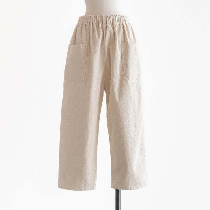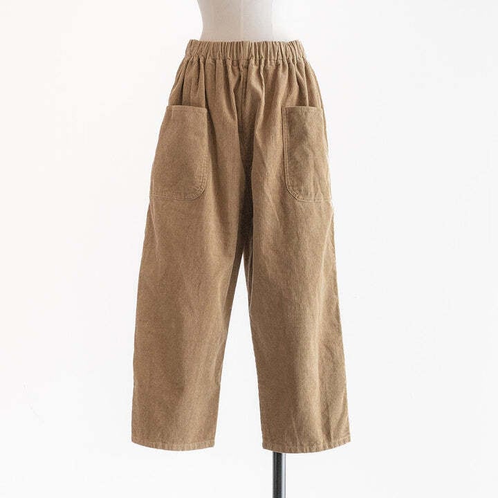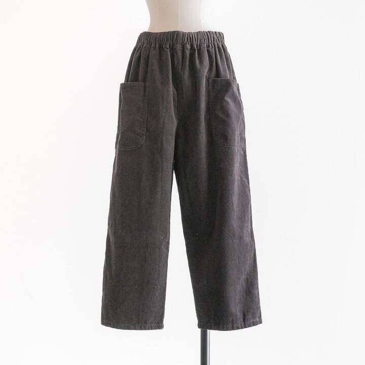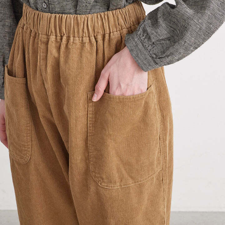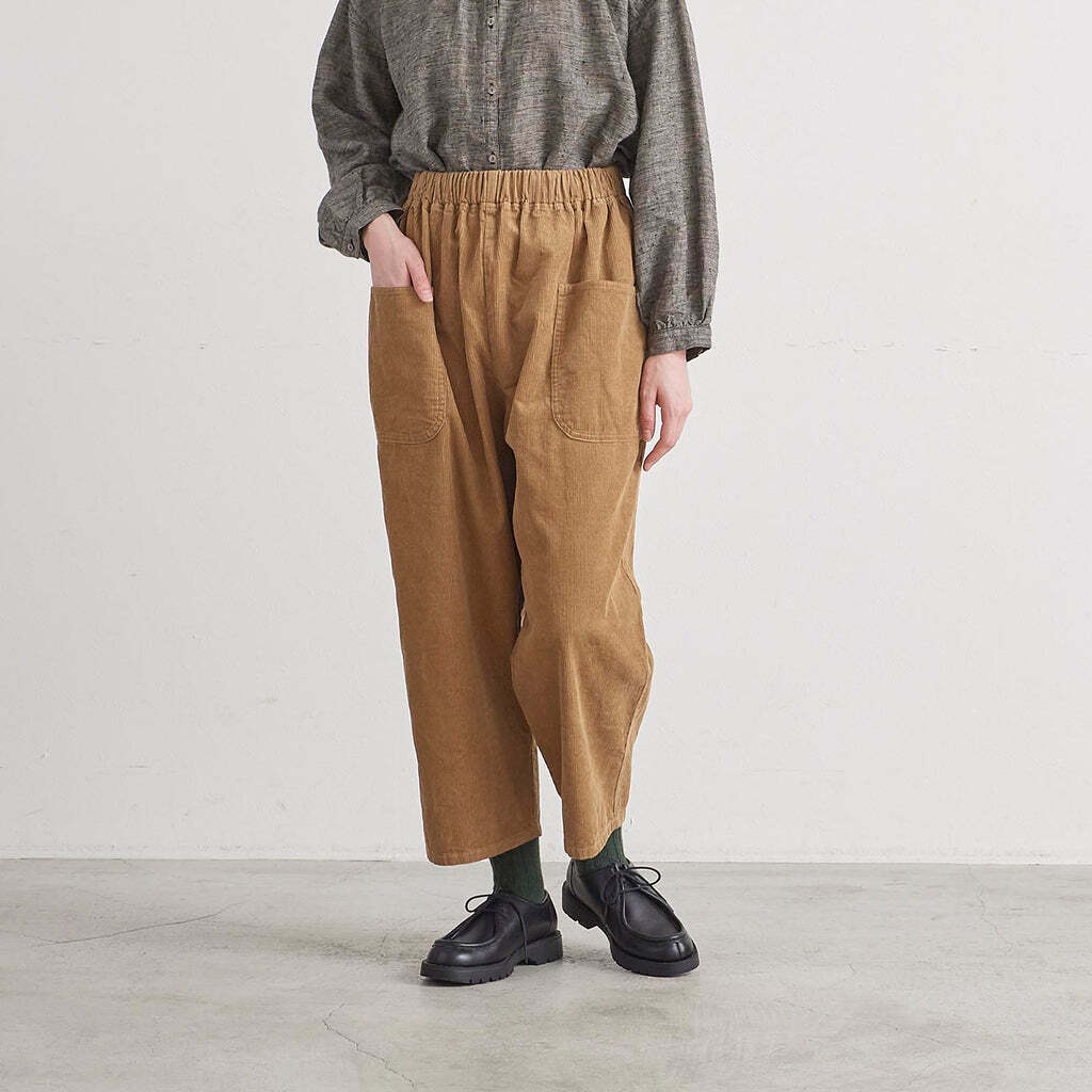 綿100%の着心地の良いコーデュロイのパンツです。生地感は柔らかく、ゆったりと気持ちのよい肌触りです。ウエストは総ゴム仕様で楽にお召しいただけ、内紐付きなのでお好きなサイズに調節していただけます。同素材のテーパード型と比べ、こちらはストレート型の仕様で比較的カジュアルな雰囲気です。ヒップサイズもこちらの方が約3㎝大きいですが、サイドポケットを両サイドに付けていることにより、ヒップをすっきり見せてくれます。着丈は91㎝と短めで脛が見える位の仕様で、ロールアップもしていただきやすいので、靴下をチラ見せさせても、秋冬ならではのショートブーツとの合わせもおすすめです。