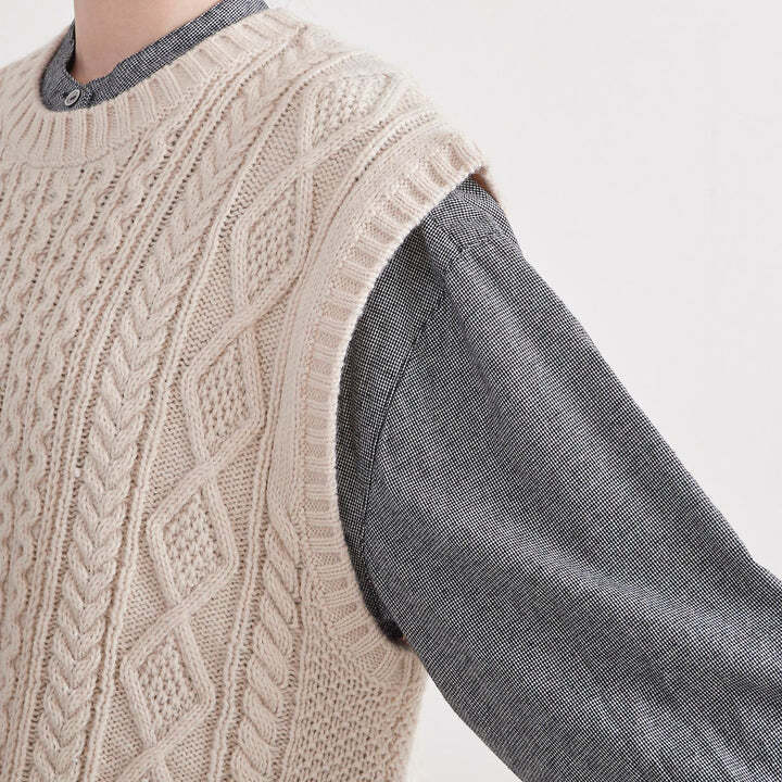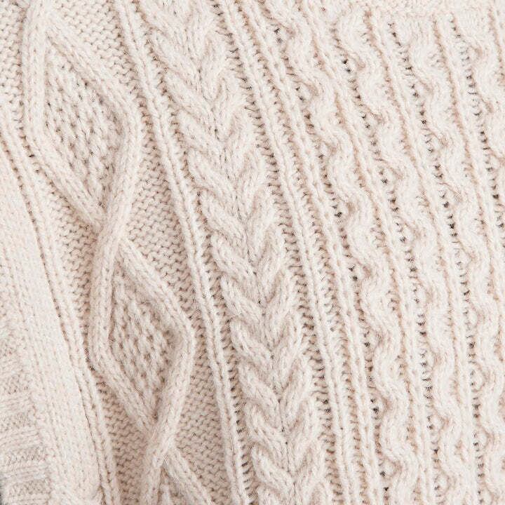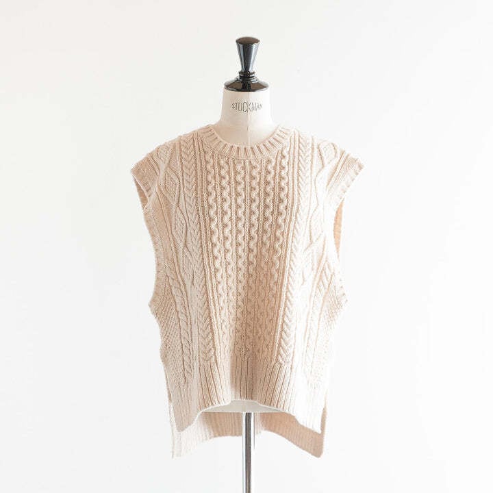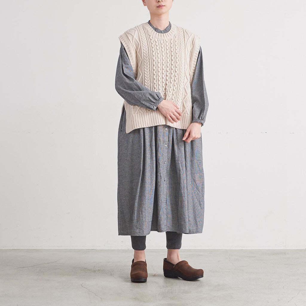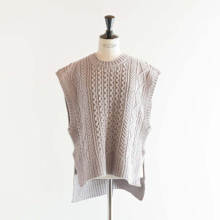 一般的なニットの素材のアクリルとウールに、アルパカをミックスした糸を使用しました。アルパカ特有の軽量ながらしっかりと暖かさを感じることができる、真冬にもぴったりなベストです。アラン編みが生み出すデザインにより着るだけで主役級のニットベストで、合わせるインナーがシンプルでも様になります。アームホールは広めでインナーの分厚さを気にせず着用ができます。後ろ身頃は前身頃より5㎝長いため、お尻がすっぽりと隠れます。両サイドの裾にスリットが入っており、腰部分を締め付けないため、トップスだけでなくワンピースに重ねての着用もおすすめです。