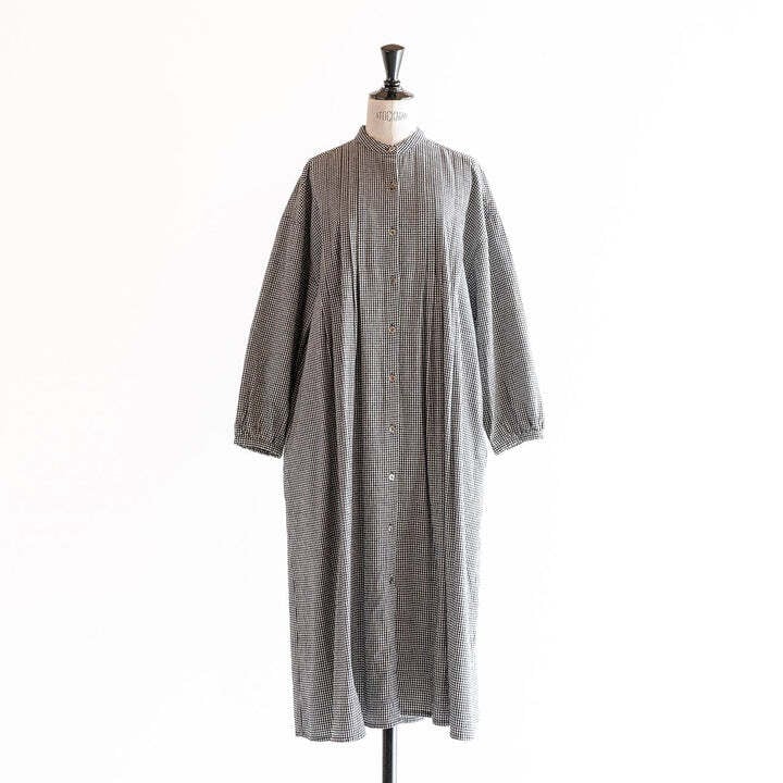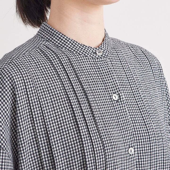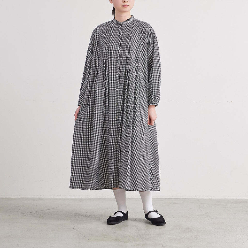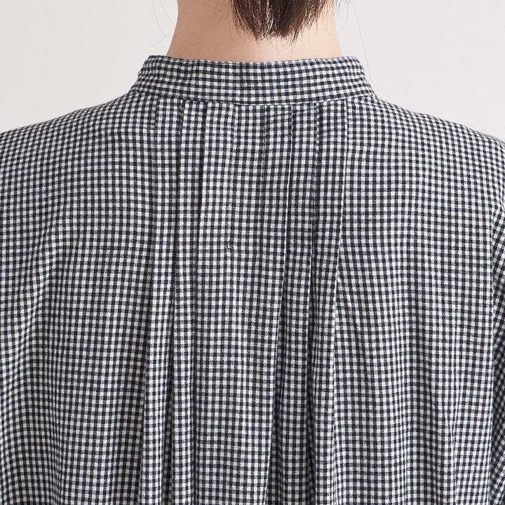 綿素材に少しのウール素材を混ぜることで、ふんわり起毛感のある秋冬らしい素材に仕上げており着用感も暖かいです。タックを前後にたっぷり入れたシャツワンピースです。1枚でワンピースとして着用しても、トップスとボトムスに羽織として着用しても様になります。スタンドカラーなので、首回りがすっきりとした印象です。ストライプ・千鳥格子・チェックと3パターンとも、秋冬を感じていただけるコーディネートになります。