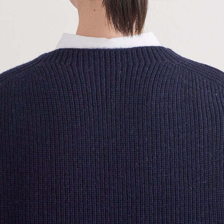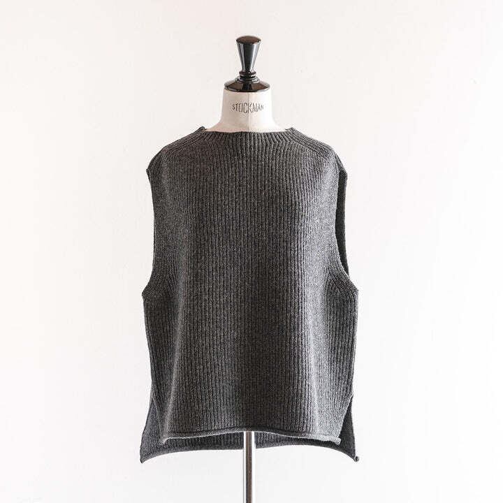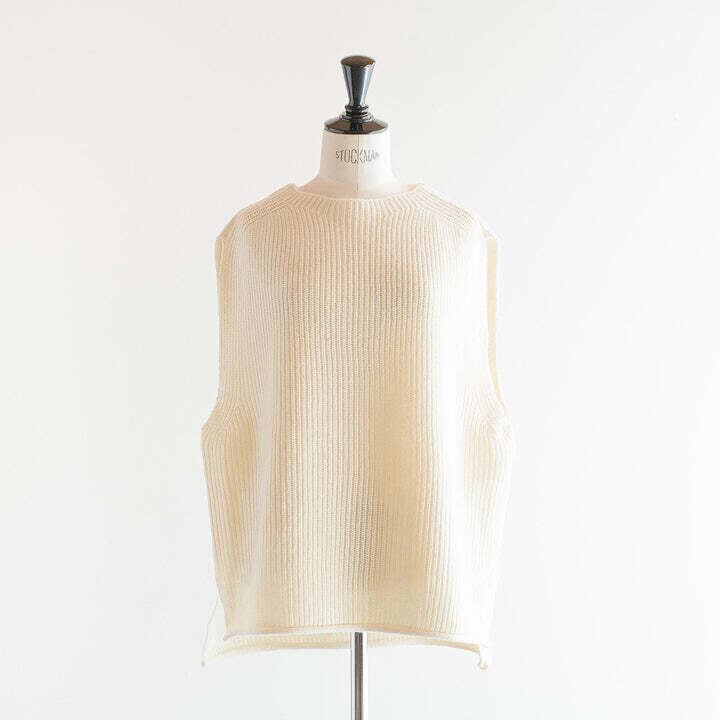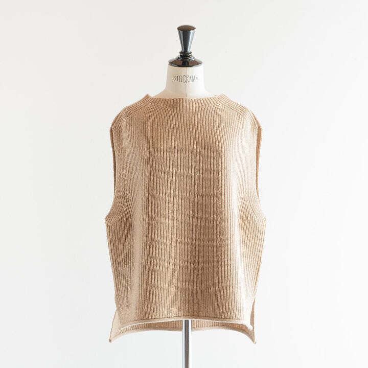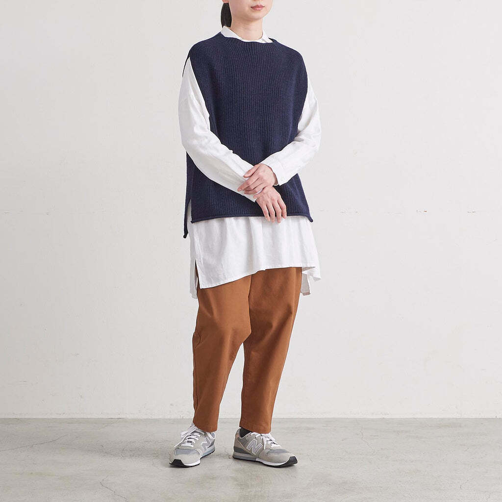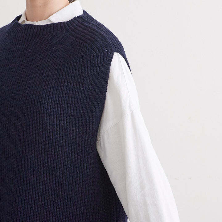 ウール混の中太の糸を使用しており、比較的肉厚なニットで真冬にも暖かく着用していただけます。デザインはシンプルでインナーが柄でも無地でも合わせやすく、シャツやカットソー、ワンピースの上に重ねるのがおすすめです。後ろ身頃が前身頃より長く、お尻が隠れる位の長さになっており、裾部分にはスリットが入っているためお尻をカバーすることができ、締め付けずにお召しいただけます。
