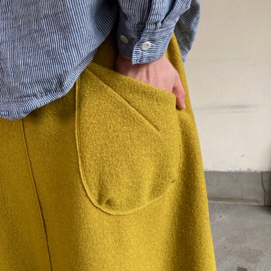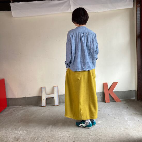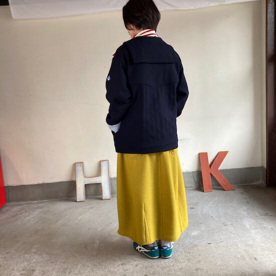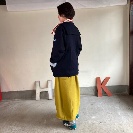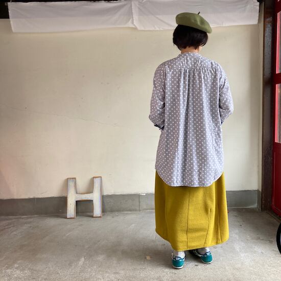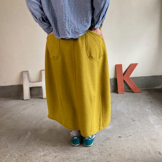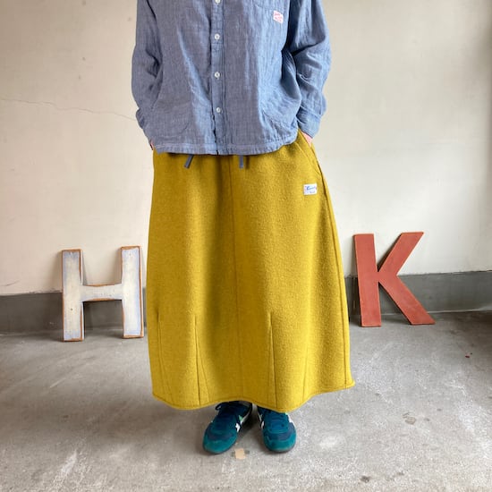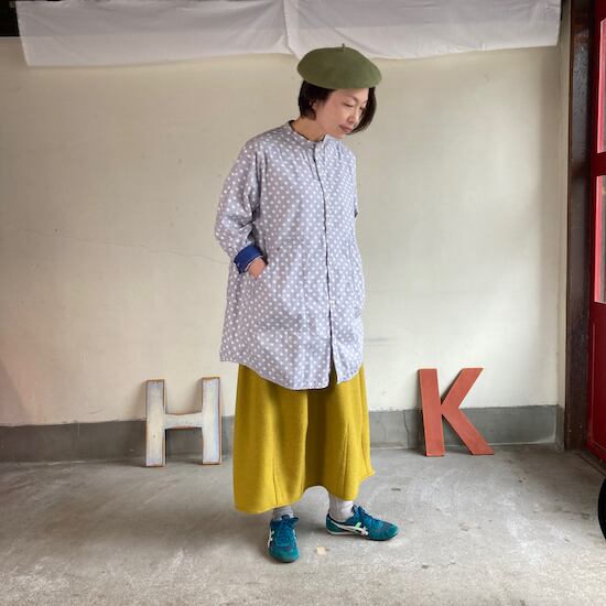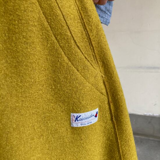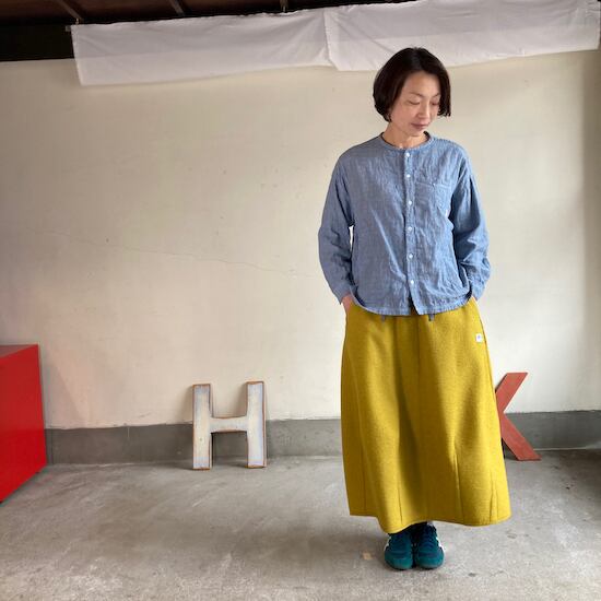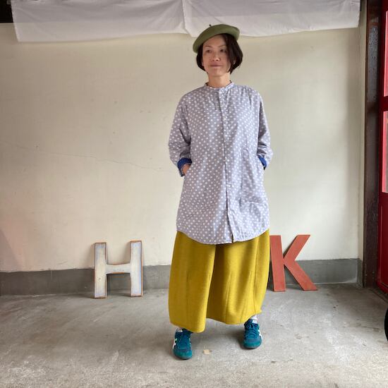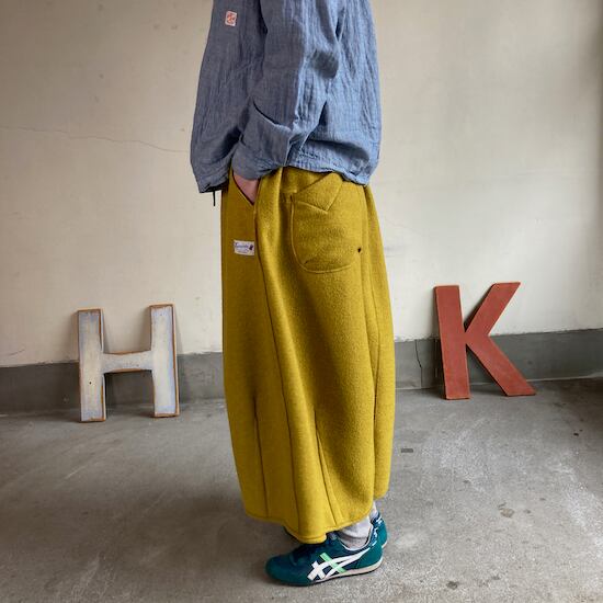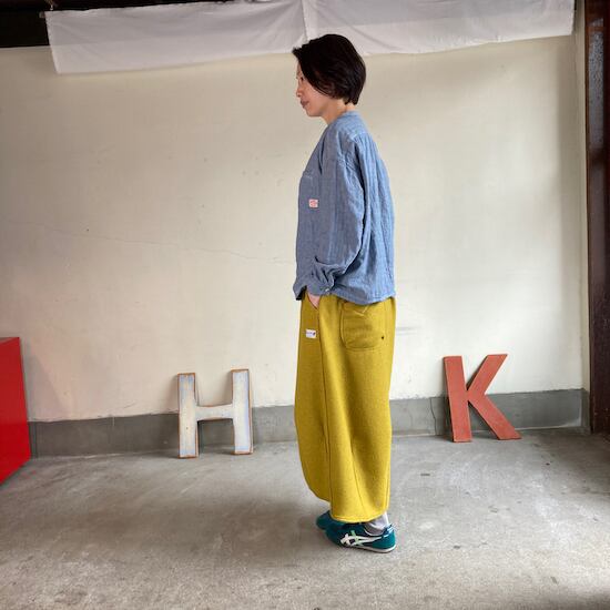 快晴堂のスカートの中でもふんわりゆったりとしたデザインです。ペインターなどのワークっぽい雰囲気の作品に比べて、レディース感があるかわいらしい雰囲気が素敵です。暖かくかわいらしい生地をふんだんに使用しているのですが、軽やかな着用感であるところもさすが!と思ってしまいますし、おすすめポイントです。