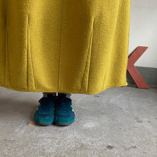 表情豊かなリングウールに圧縮をかけることであたたかみのある独特な質感となっております。店頭で試着していただいた際にも強く感じますが、軽やかさとしなやかさを兼ね備えた作品と言えます。「軽ーい」「シルエットがきれいだね!」などという感想が多く聞かれます。とても素敵な雰囲気です。