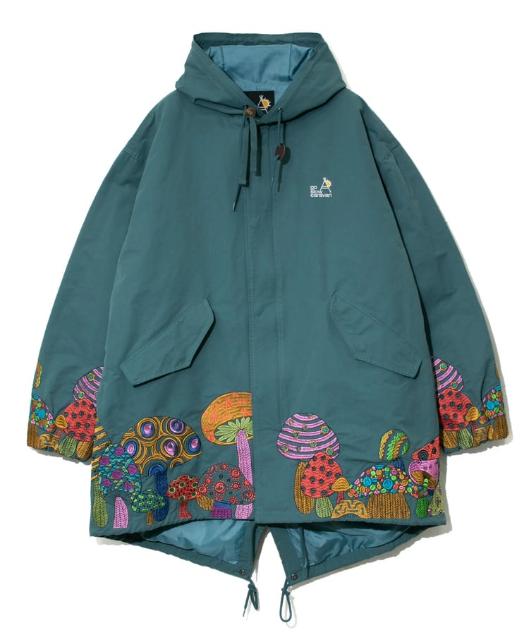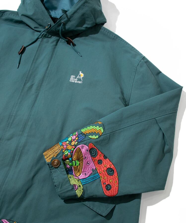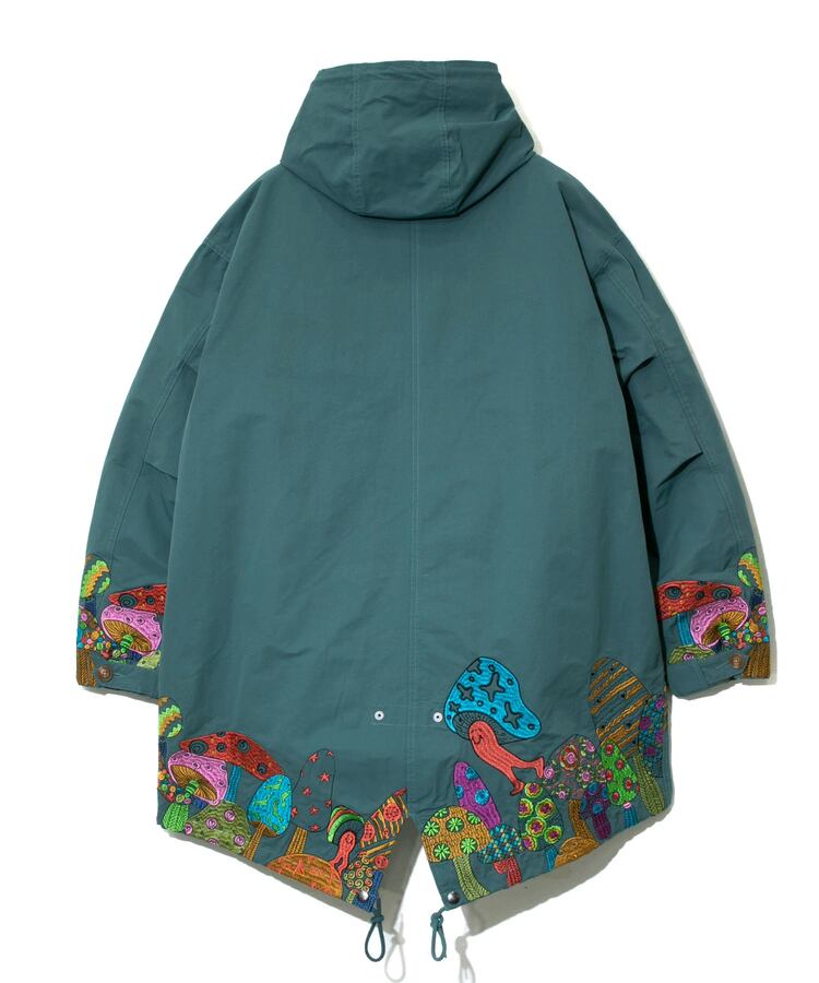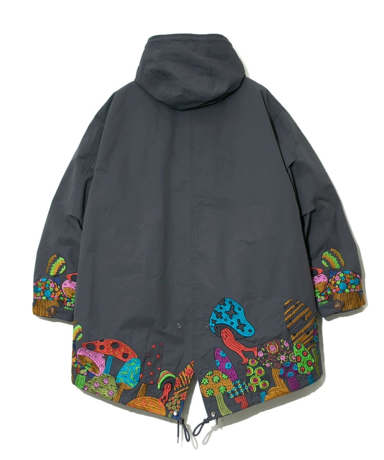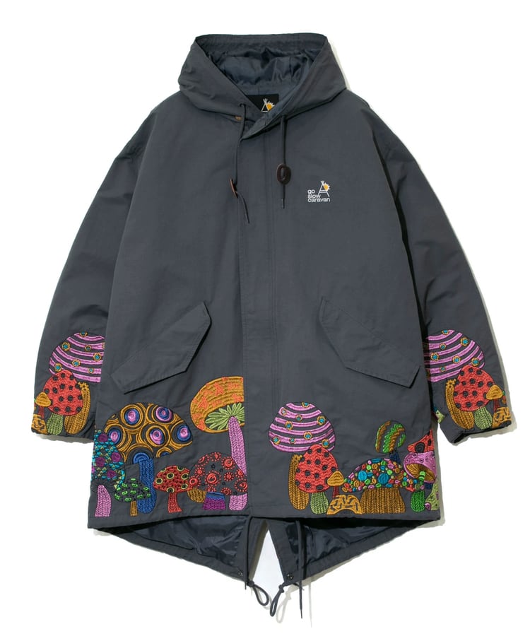 裾から腰にかけてポップなキノコを贅沢に刺繍したモッズコート。ミリタリーアイテムにゴースローらしさ全開の刺繍が入ることにより、かなり存在感のあるアイテムへと昇華。生地をライトでシャリ感のあるコットン/ナイロンにすることで少しだけ軽量化も実現しました。