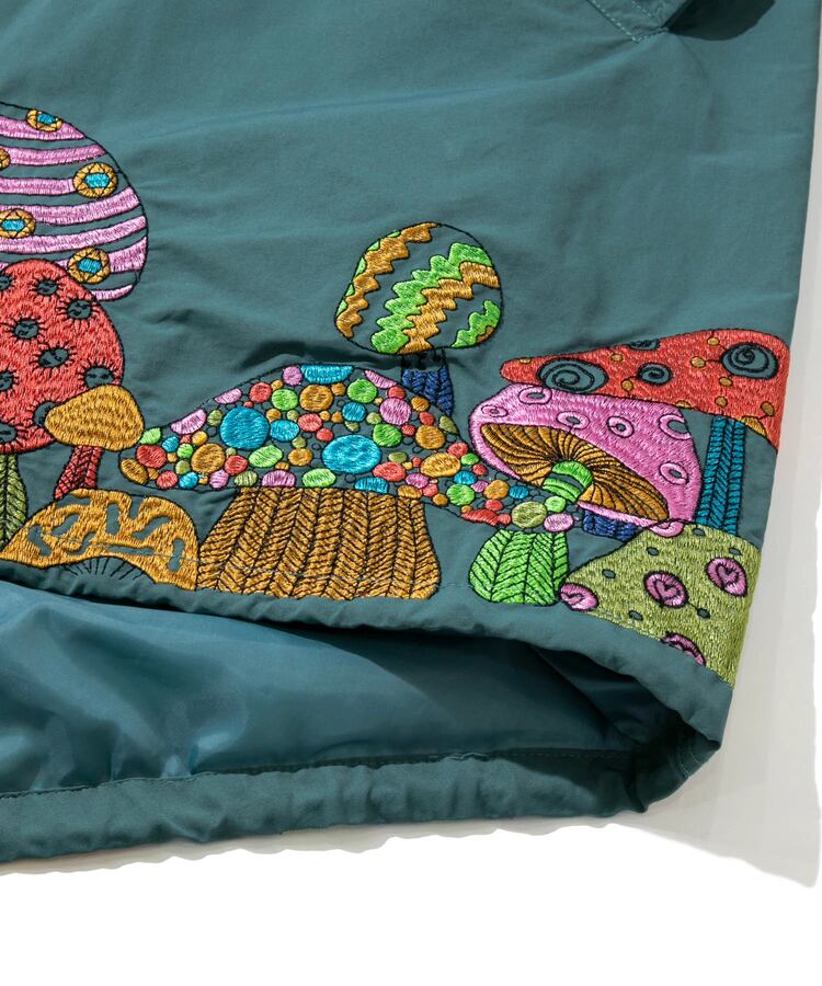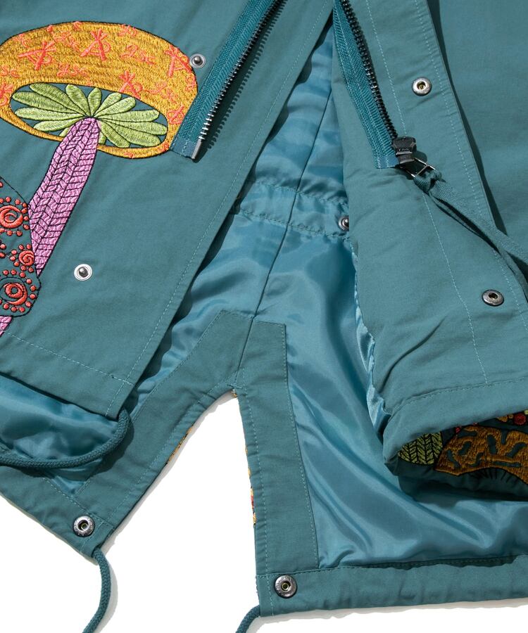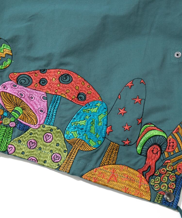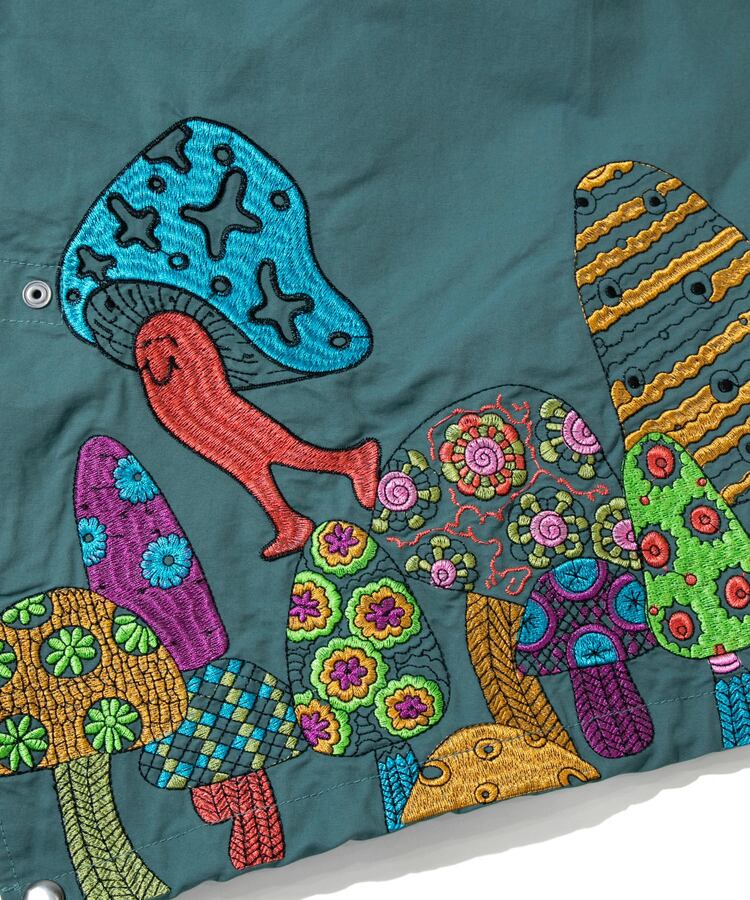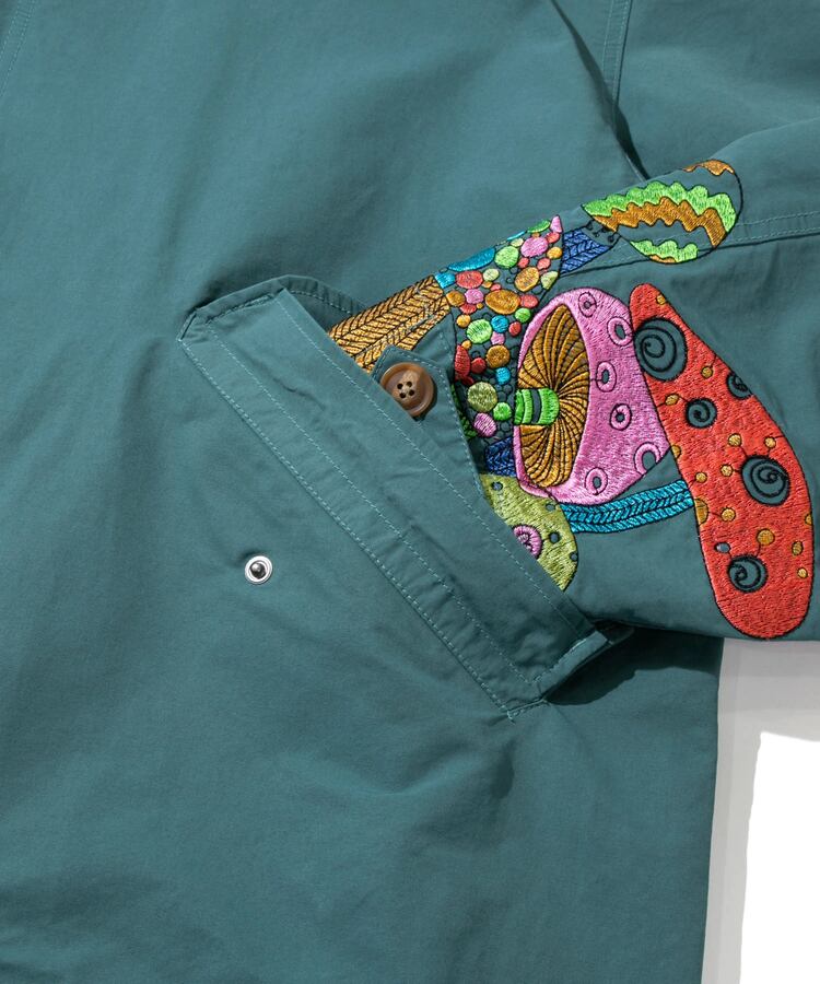 裾から腰にかけてポップなキノコを贅沢に刺繍したモッズコート。ミリタリーアイテムにゴースローらしさ全開の刺繍が入ることにより、かなり存在感のあるアイテムへと昇華。生地をライトでシャリ感のあるコットン/ナイロンにすることで少しだけ軽量化も実現しました。