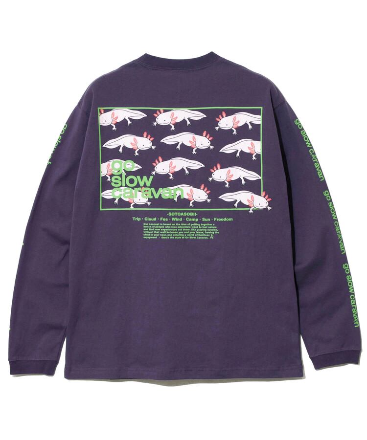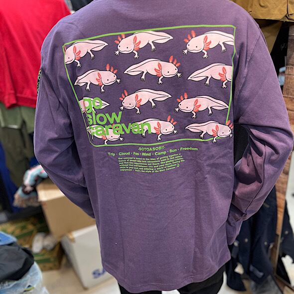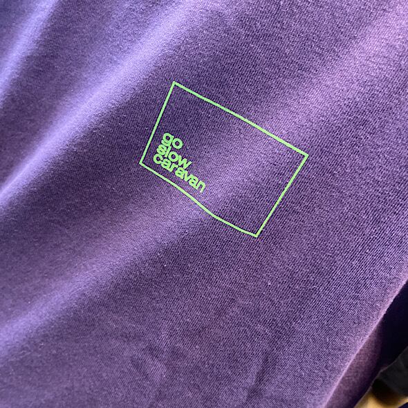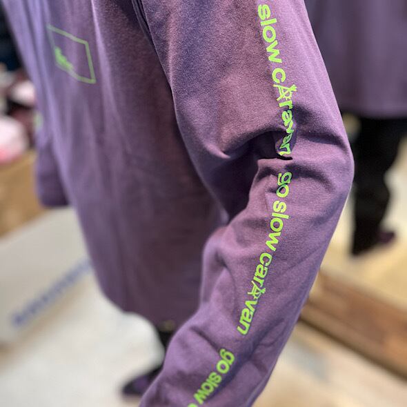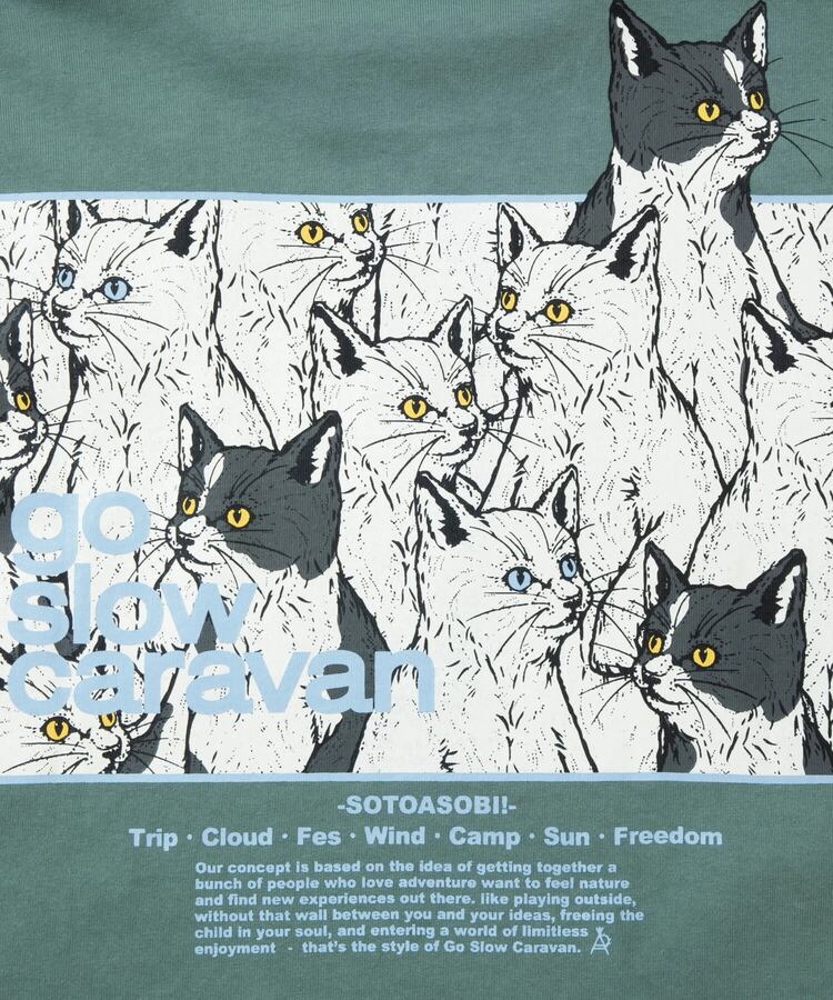 背中にゴースローキャラバンのイメージグラフィックとコンセプト、袖にはgo slow caravanのラインプリントされた人気のプリントTEE