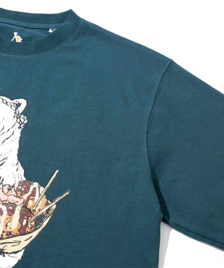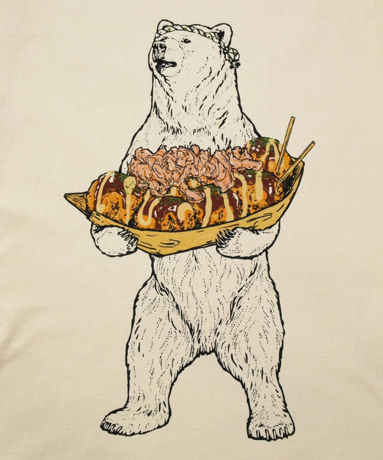 ソースとマヨネーズたっぷりの屋台のたこ焼きを抱えたクマのロングスリーブTです。