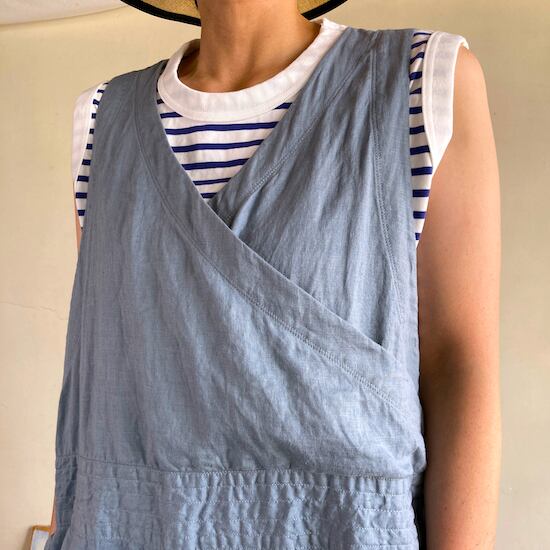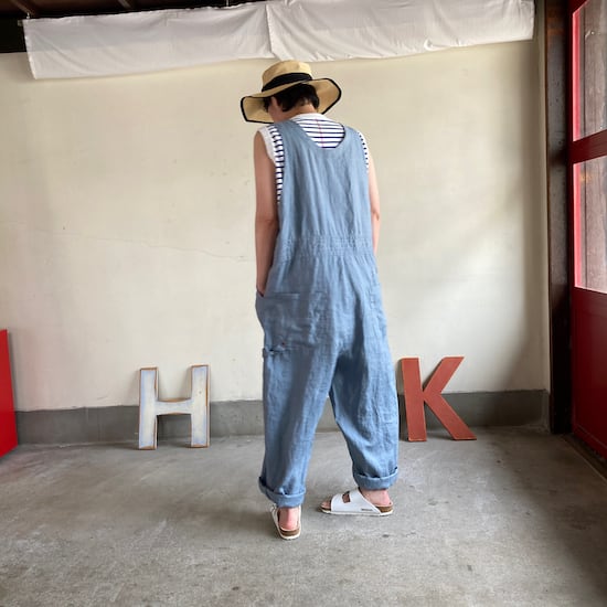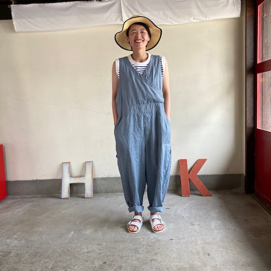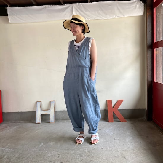 カシュクールサロペットパンツはさらっとセットアップのような雰囲気で着こなしやすい作品かと思います。軽装になりがちな夏の着こなしがリラックスしながらしっかりとおしゃれな雰囲気に!カシュクールタイプですので幅広い体型の方に対応しやすいです。