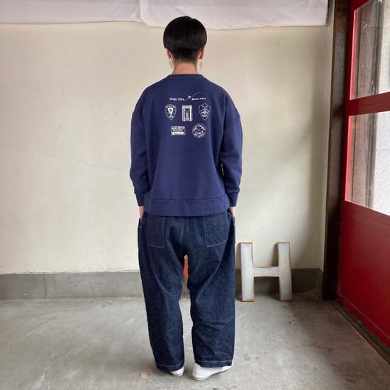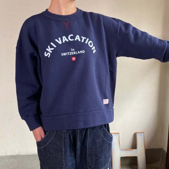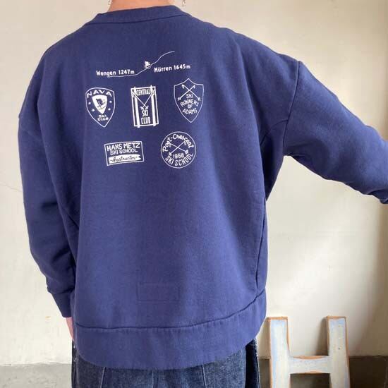 こちらは「スイスでスキーバケーションを」をテーマにスキースクールのワッペンなどが描かれております。スイスでスキー休暇、乗るのは特急『エーデルワイス』かもしれませんね!背中のモチーフはスキースクールのワッペンなどを集めました。スイスのスキーリゾートとして名高い、ミューレンとウェンゲン。谷を挟んだ両側の村の高低差はおよそ4000m。こちらはレディースのワイドタイプのスウェットです。メンズライクなすっきりとしたシルエットのボディーと比べてご覧ください。