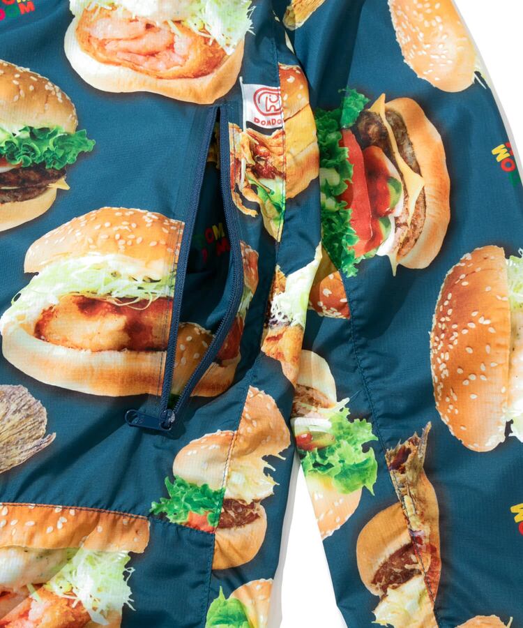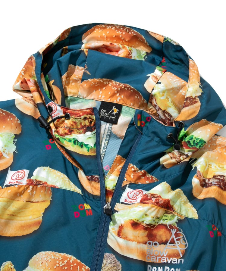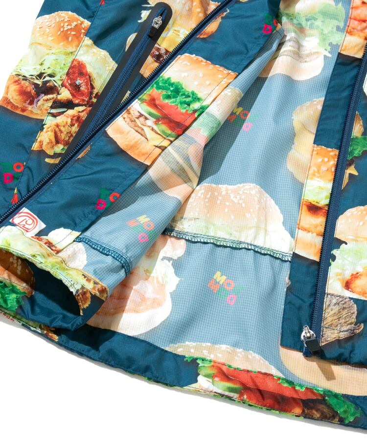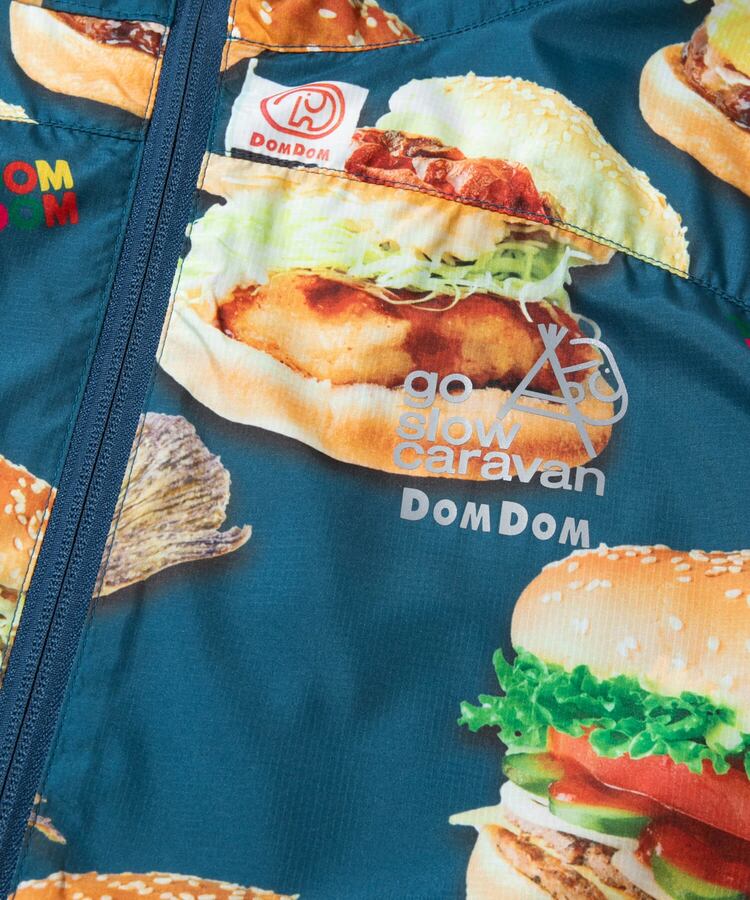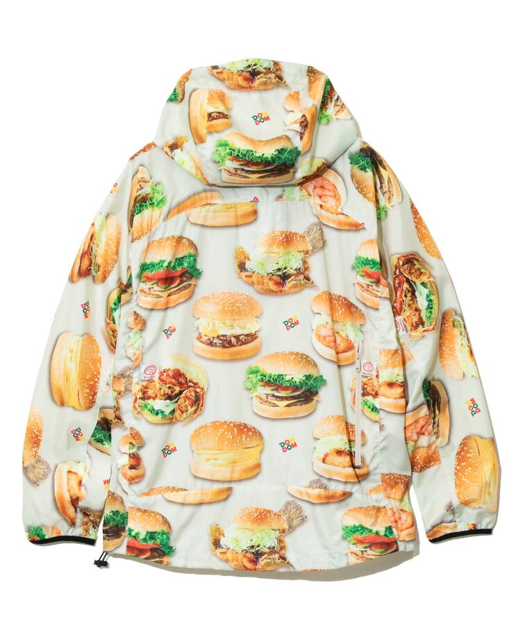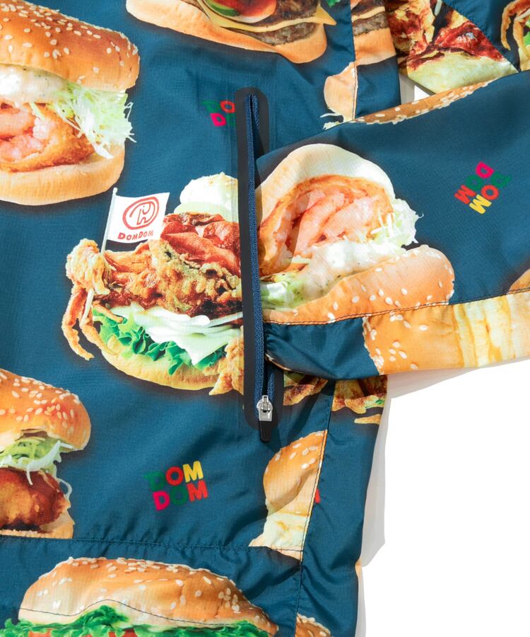 撥水加工が施された軽量のマイクロリップ素材に、ドムドムのユニークなハンバーガーたちを総柄プリント。背中のファスナーポケットでポケッタブル仕様になり、小さく畳んで持ち運べます。旅行やキャンプ、ハイキングなど、肌寒い時にかるく羽織れる外遊びには欠かせないアイテムです。