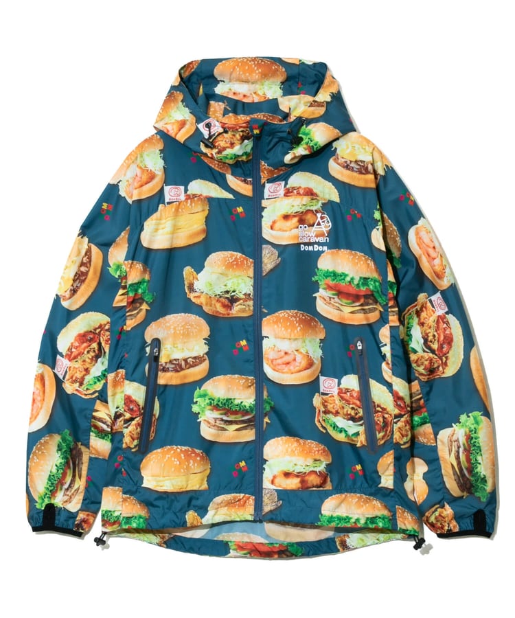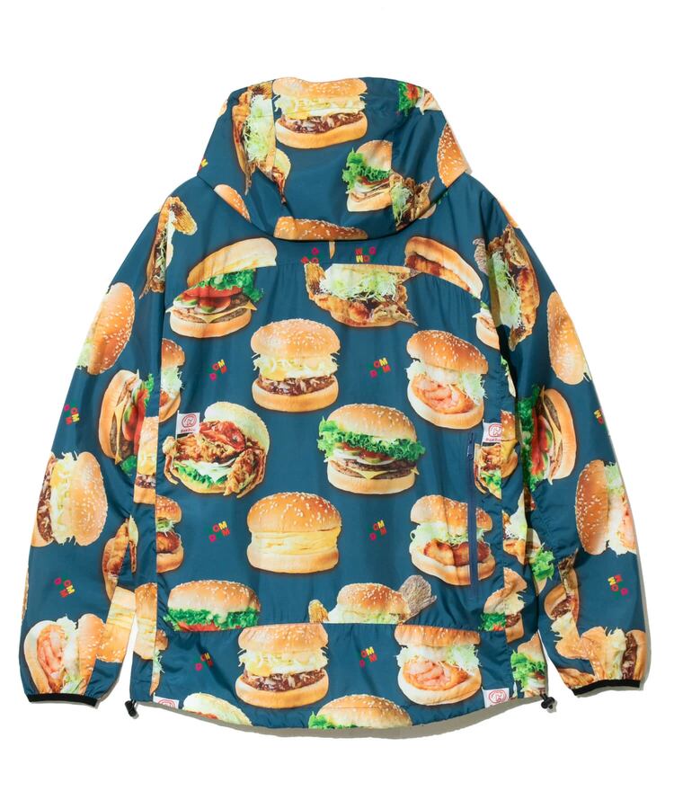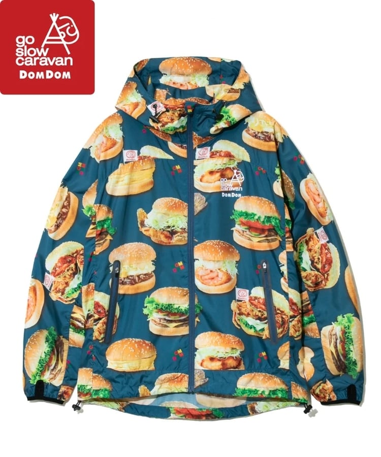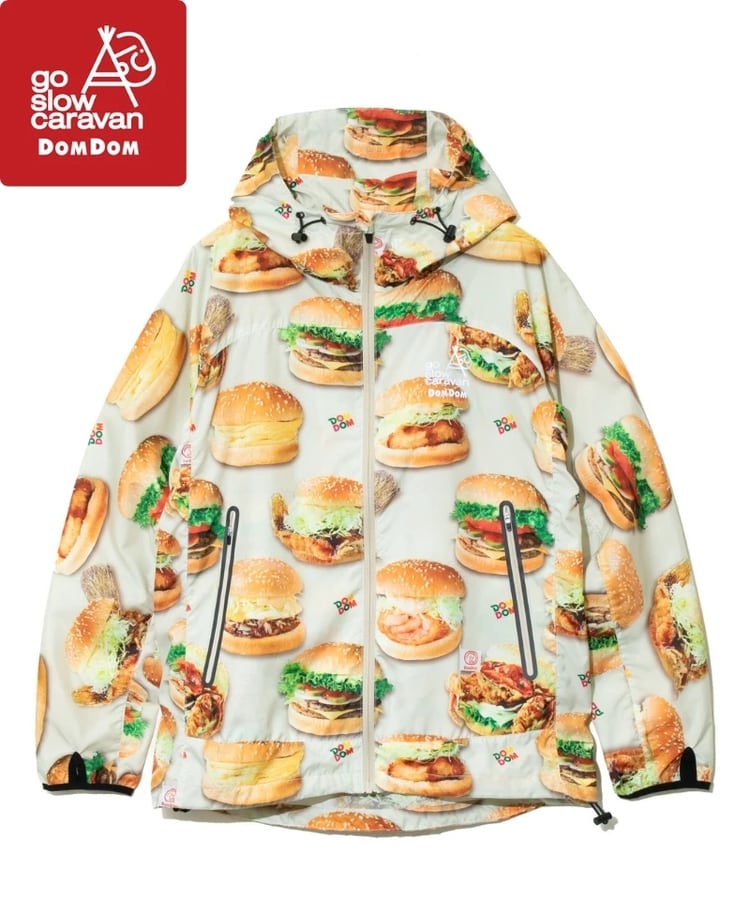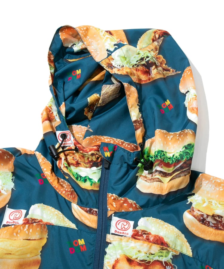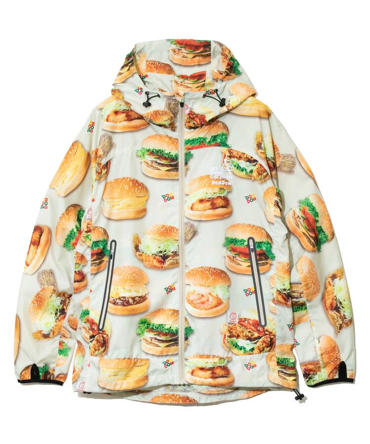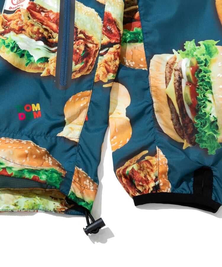 撥水加工が施された軽量のマイクロリップ素材に、ドムドムのユニークなハンバーガーたちを総柄プリント。背中のファスナーポケットでポケッタブル仕様になり、小さく畳んで持ち運べます。旅行やキャンプ、ハイキングなど、肌寒い時にかるく羽織れる外遊びには欠かせないアイテムです。