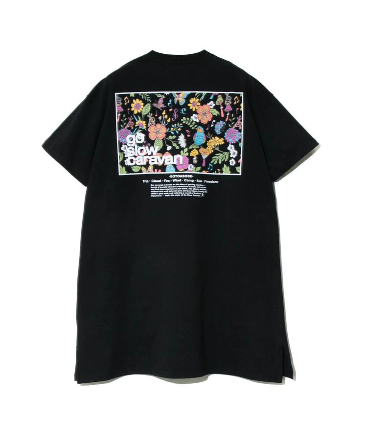 背中にゴースローキャラバンのイメージグラフィックとコンセプトをプリントした人気のプリントTEEのゆったりチュニック丈にしました。