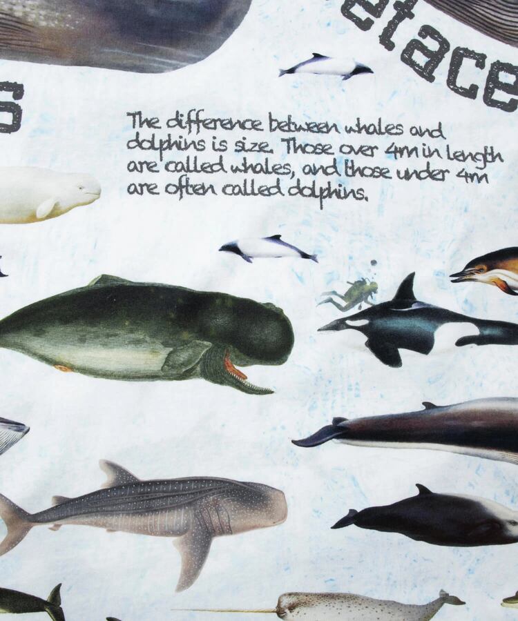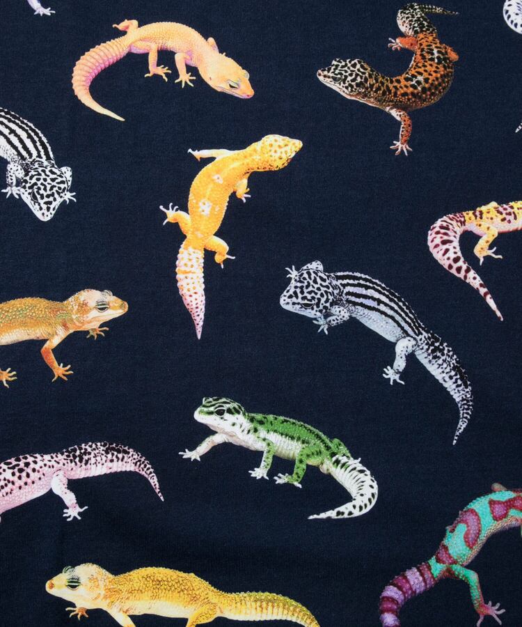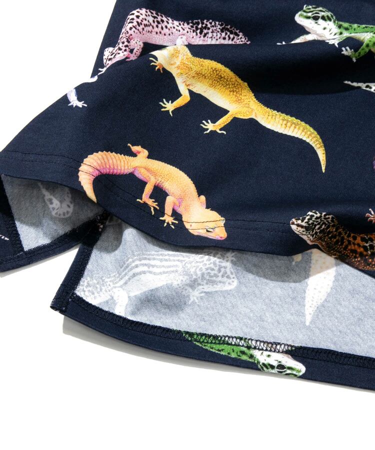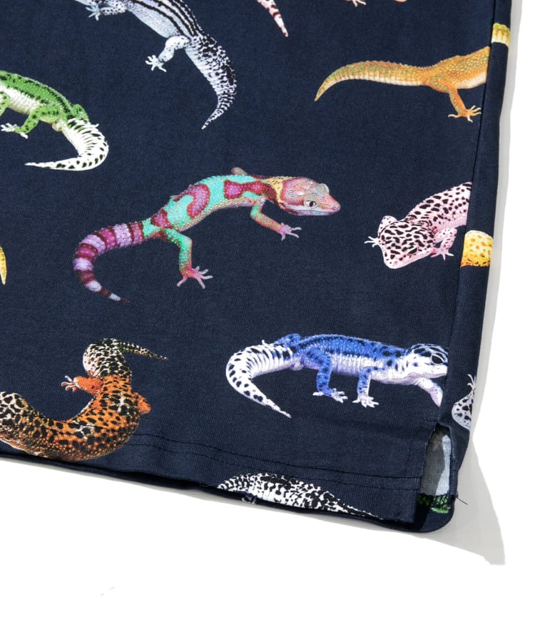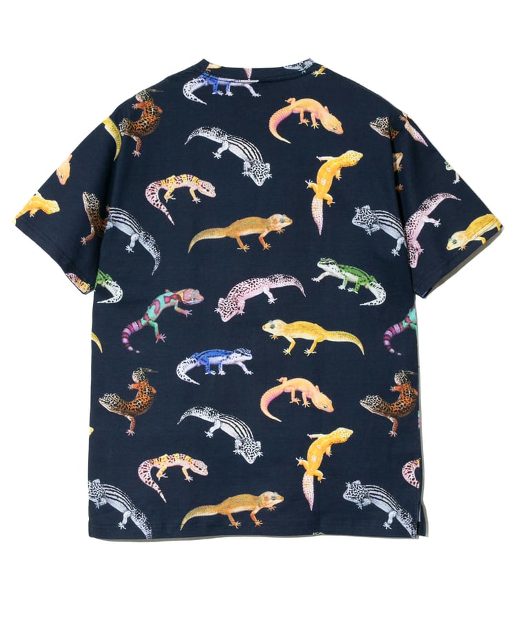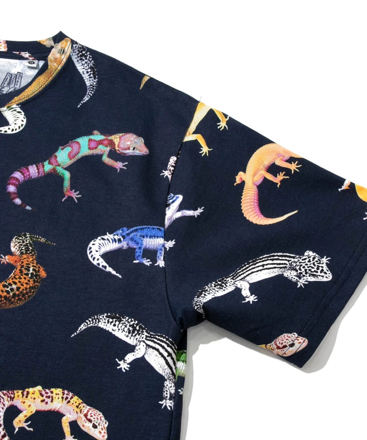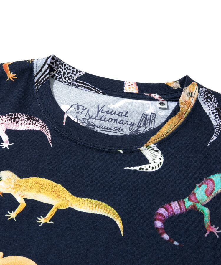 図鑑をテーマにした総柄のプリントTシリーズ。キャンプで出会える動植物たち、鯨の仲間たち。(1匹魚類が紛れています)、ほぼ実寸大のレオパたち。実際には存在しない想像上のカラーリングのレオパもいます。
