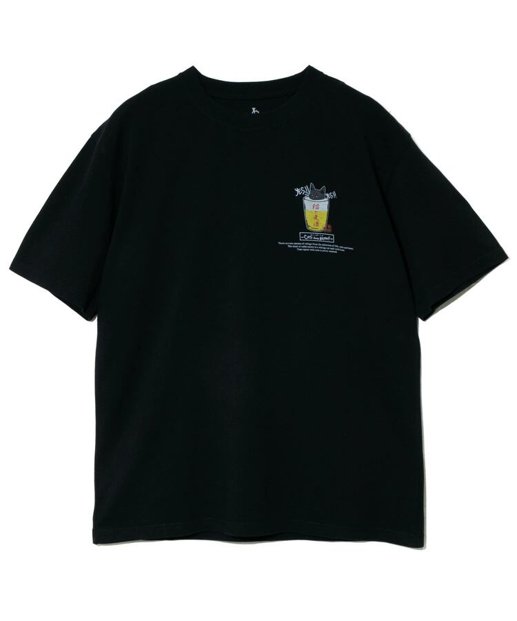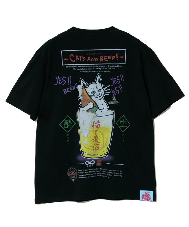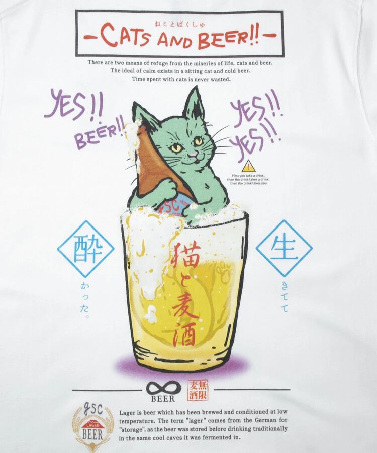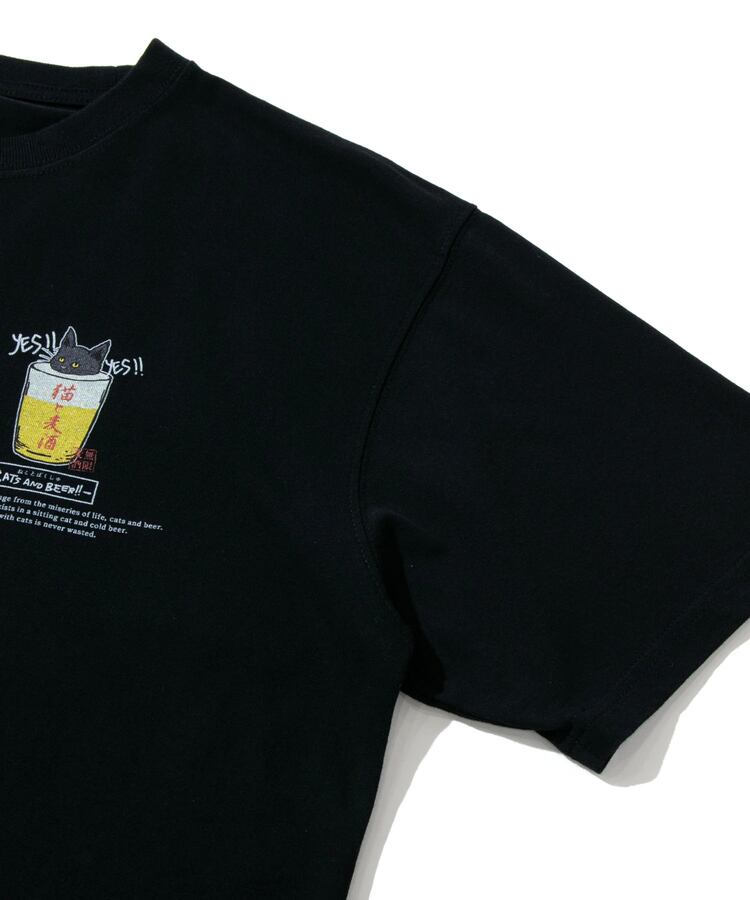 生地馴染みのいいプリント手法でカラフルにバックプリント。フロントにはグラスビールに肩まで浸かった猫のワンポイントプリント。