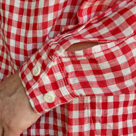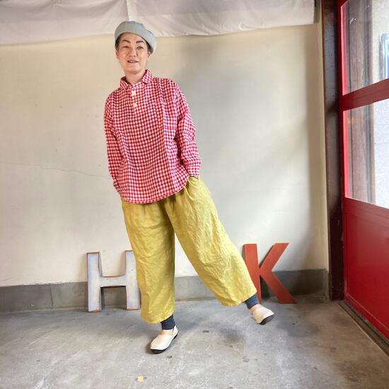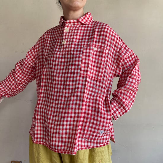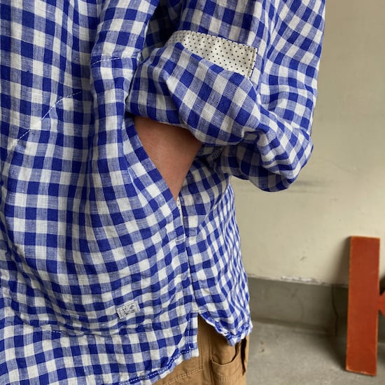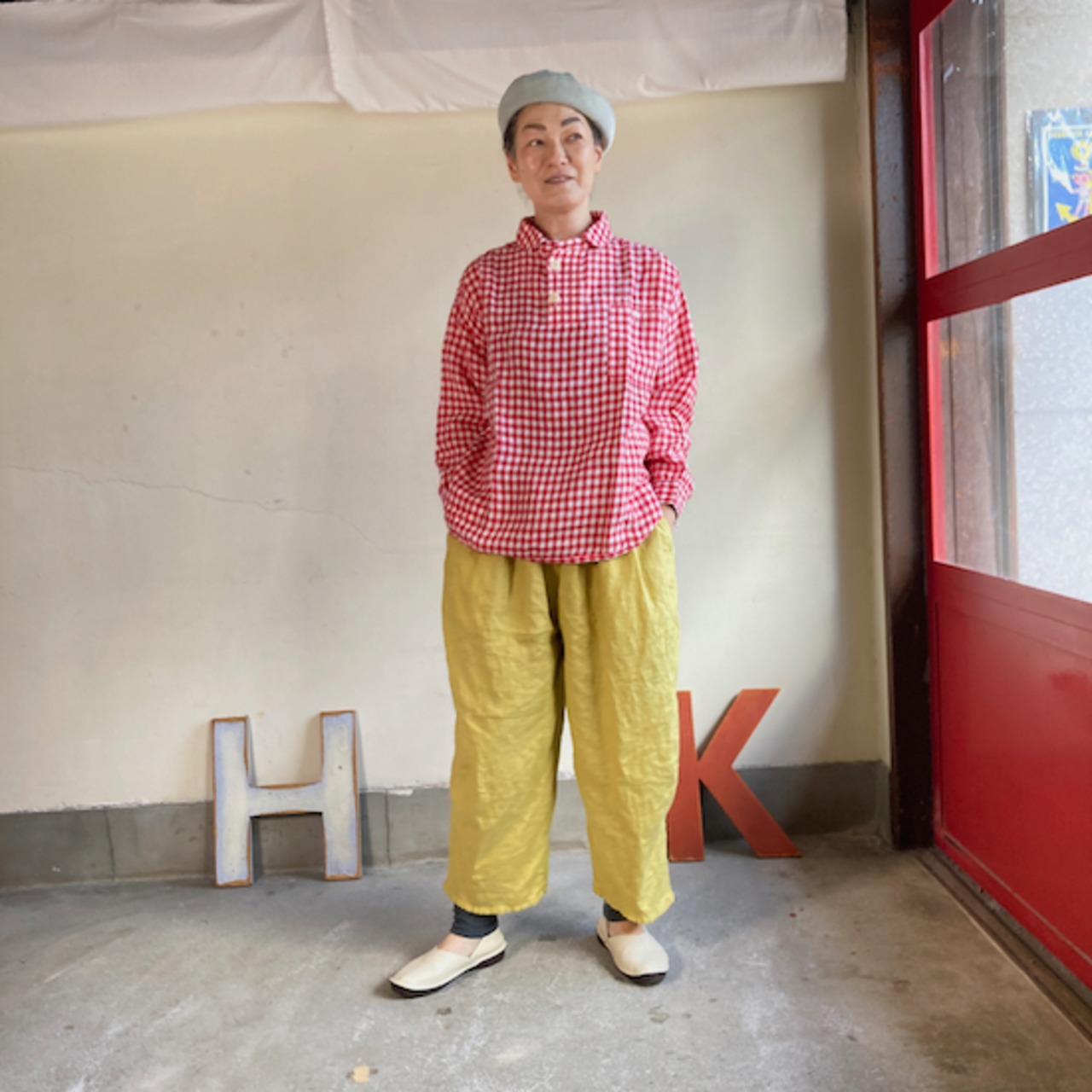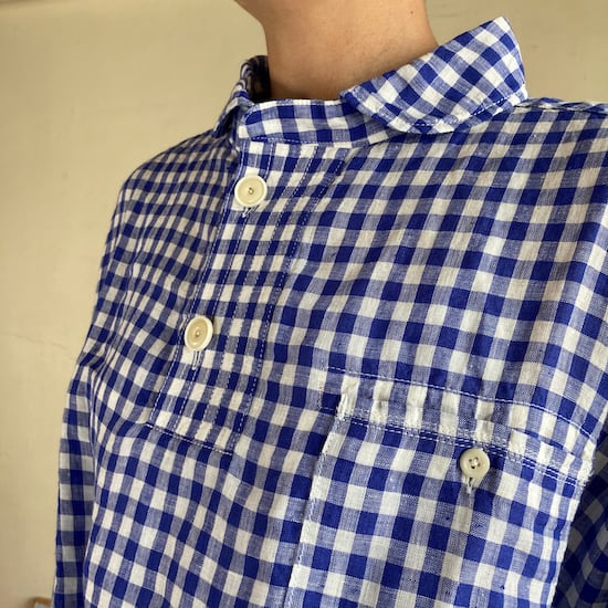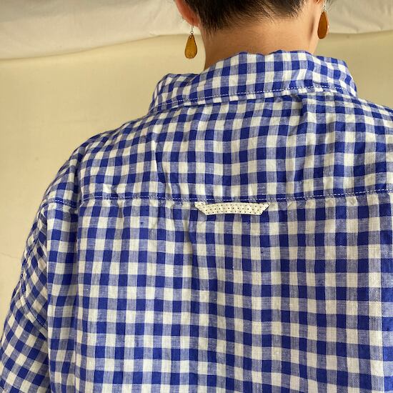 シリーズの説明文でもご紹介した通り、ちょうど良いピッチのギンガムですので、一枚で着ても充分な華やかさと存在感がありますし、ジャケットのインナーで着ていただいても主張しすぎなく合わせやすいです。様々な作品と着合わせて、おしゃれを楽しんでいただける作品かと思います。