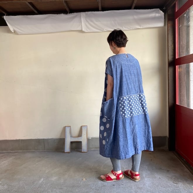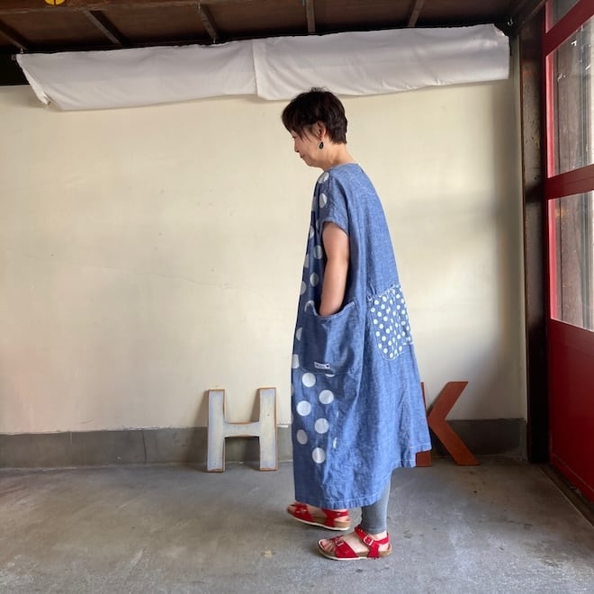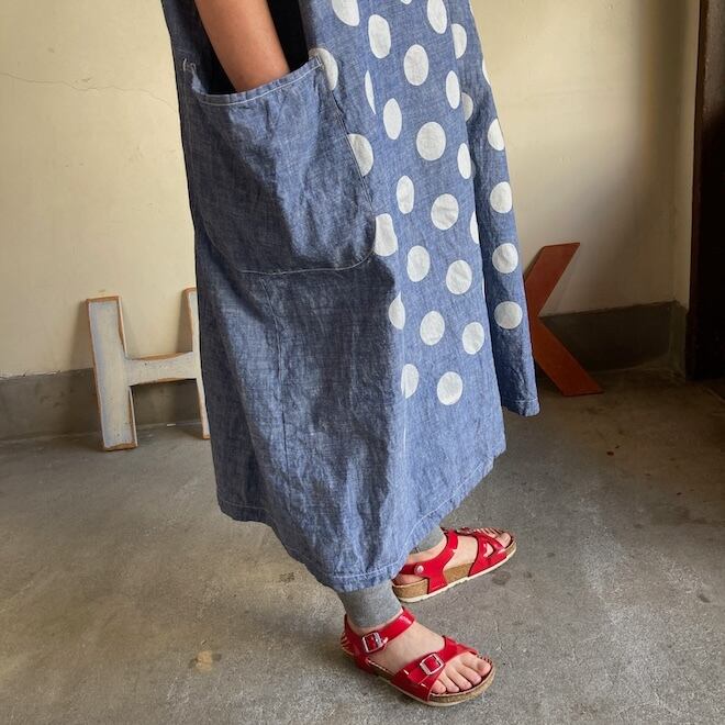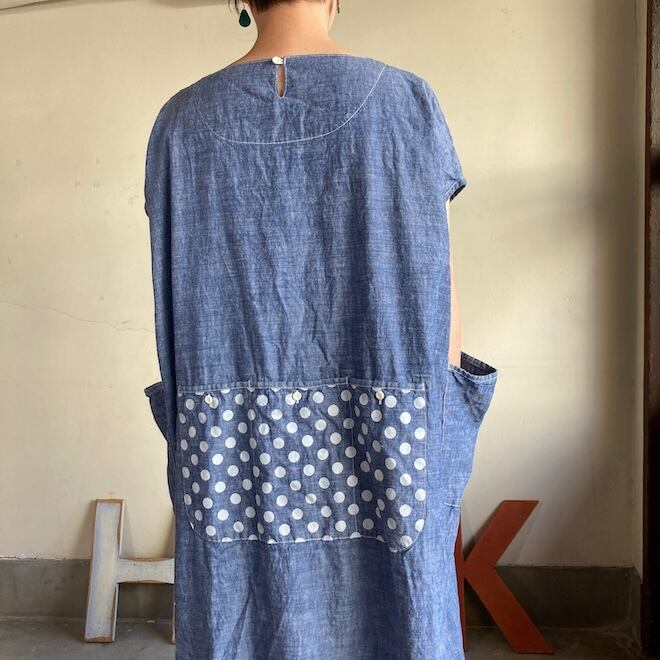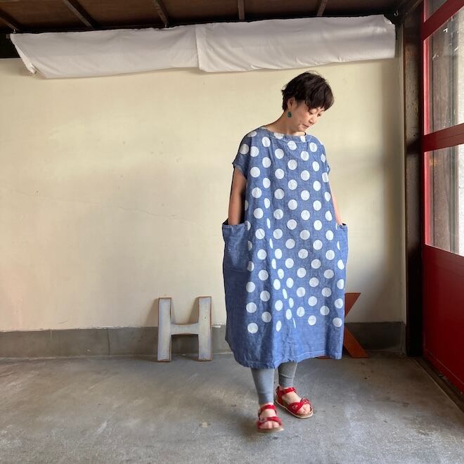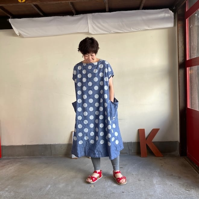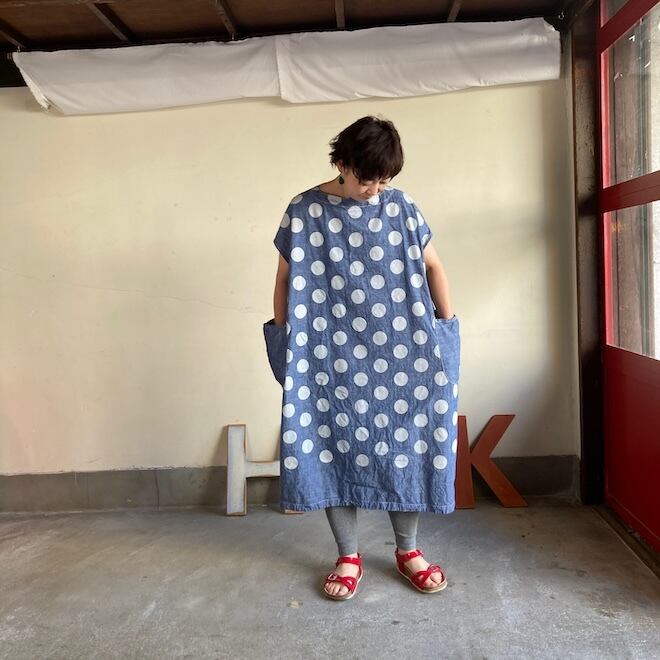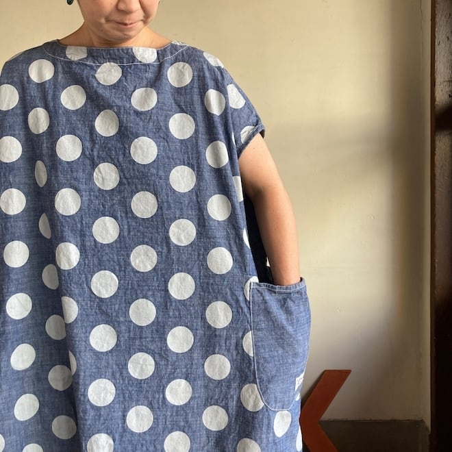 今回はこのダンガリー生地に水玉をパネルプリント。各アイテムの水玉は生地の無地部分とのバランスを見つつ、配置されております。夏のリラックスできる、でもカジュアル過ぎない洋服です。
