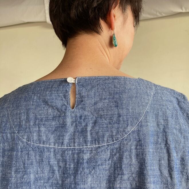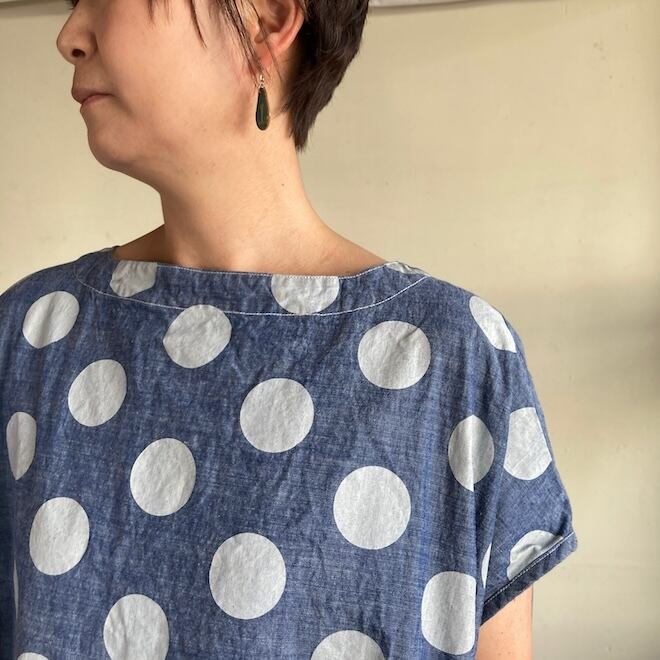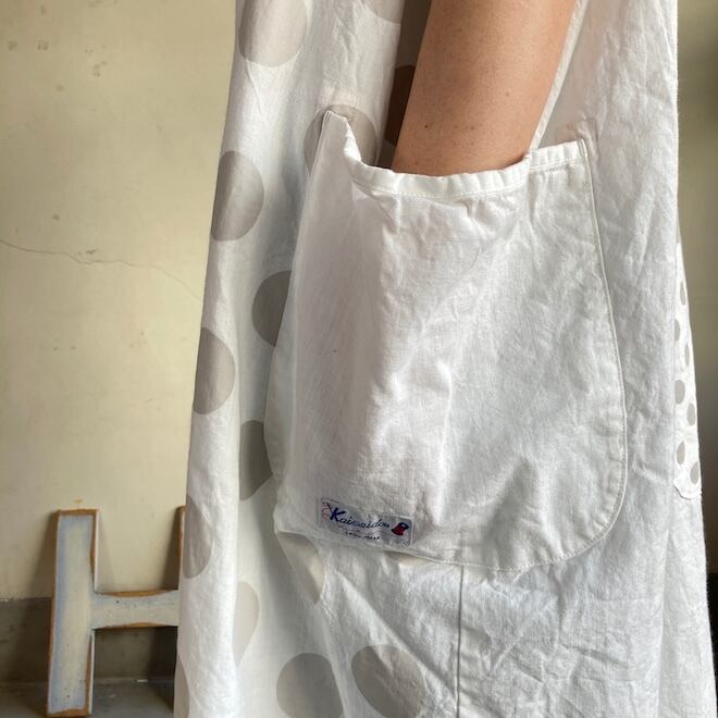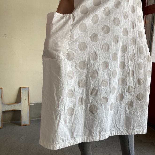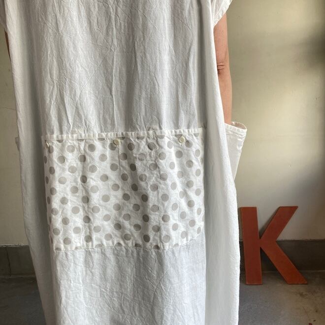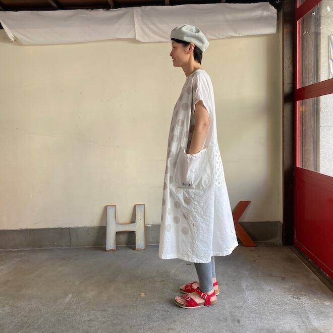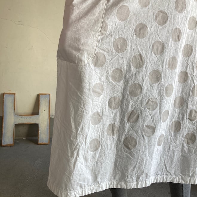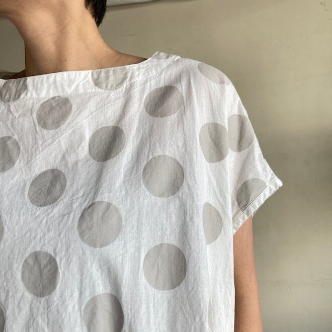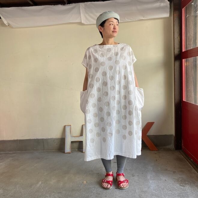 今回はこのダンガリー生地に水玉をパネルプリント。各アイテムの水玉は生地の無地部分とのバランスを見つつ、配置されております。夏のリラックスできる、でもカジュアル過ぎない洋服です。