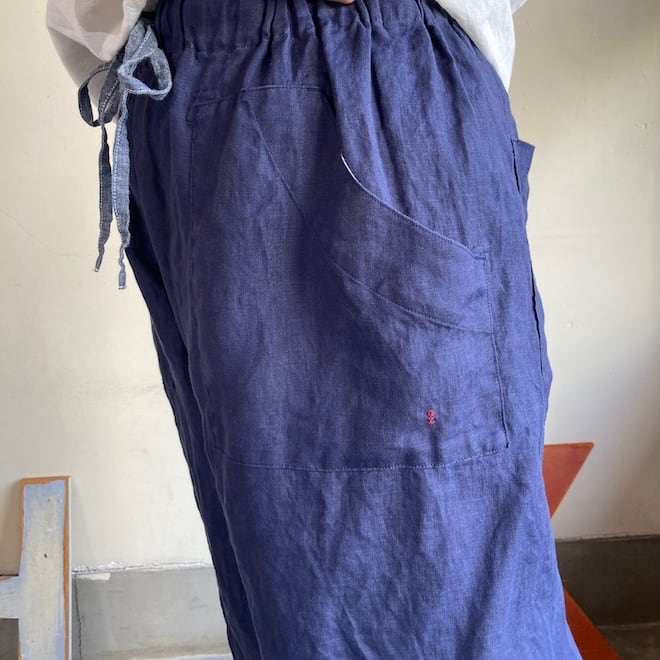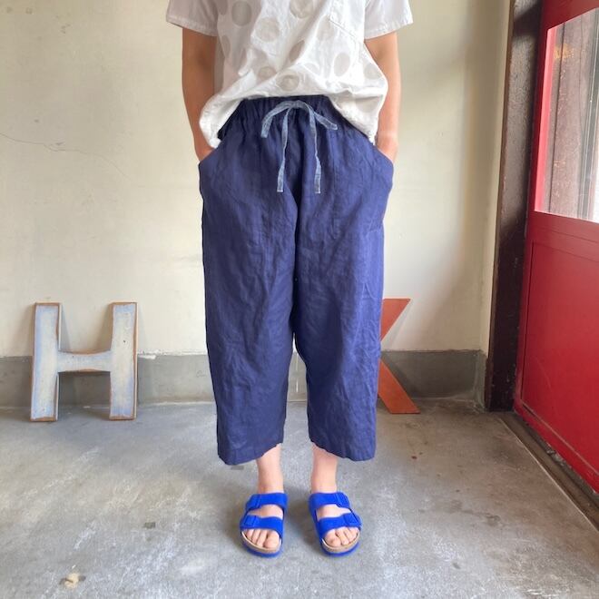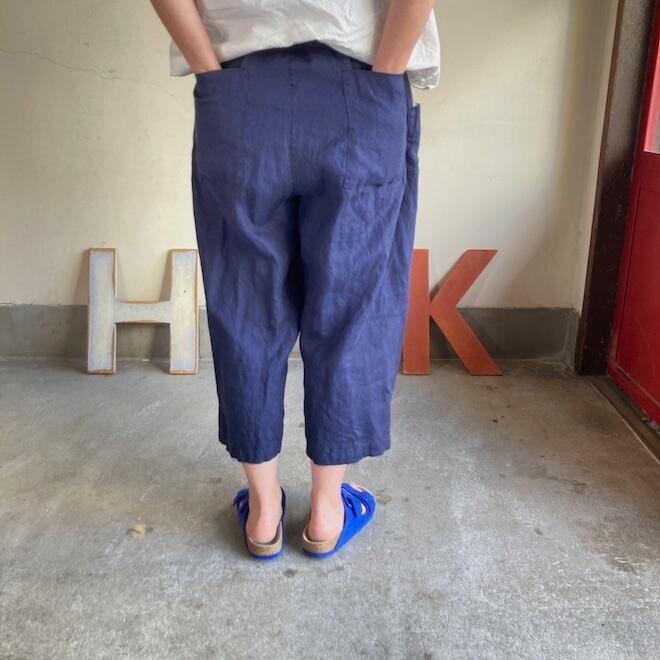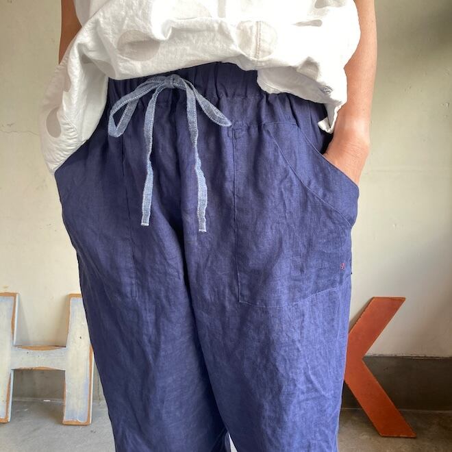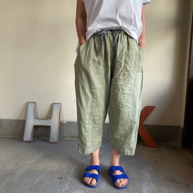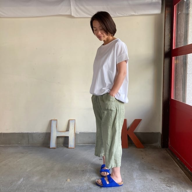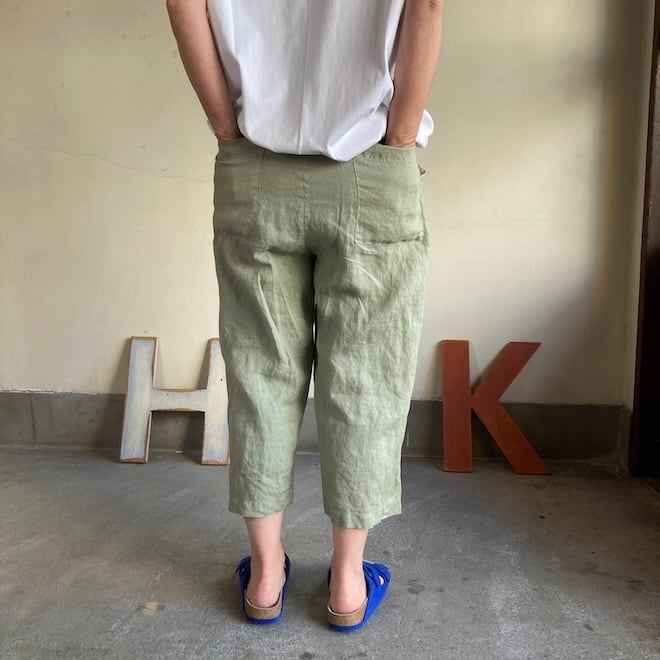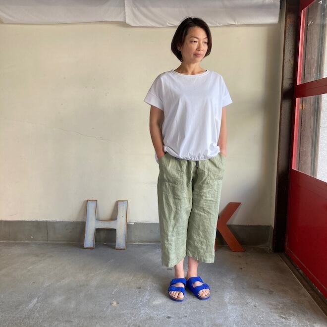 2023年のジャパンリネンのパンツは着丈を長めにかっこいい雰囲気で背が高い方にすすめやすい作品でした。2024年の春はゆったりと着こなしやすいふわふわタックパンツ。こちらは夏にぴったりのすっきりとした着丈で涼しく履きこなせますし、小柄な方にとっても裾さばきが良く取り組みやすい作品かと思います。すっきりとした着丈を活かして秋口にブーツなどを合わせるのも良いですよね。