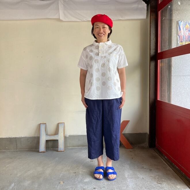 非常に暑くて長かった2023年の夏、いつもなら秋服を着る時期なのにまだまだ夏服を着る、残暑の時期の服の選びにくさが目立ったような印象がありました。当店でもその傾向に対する新たな提案を模索していたところでしたが、快晴堂さんは6月末あたり発売のジャパンリネンの色味をやや落ち着いたものにすることで涼しい素材であるけれど、秋にも着やすい色味で仕上げるという作品を発売してくれました。