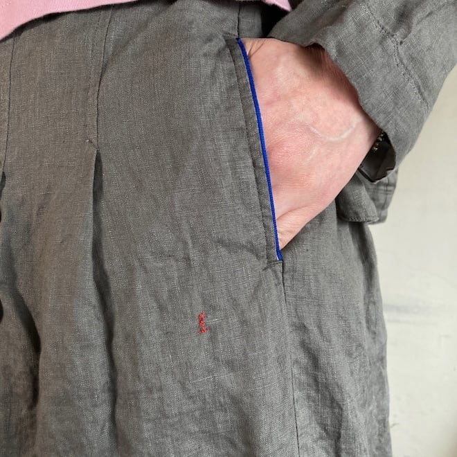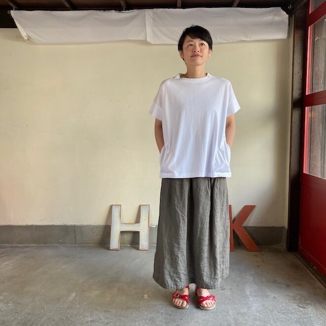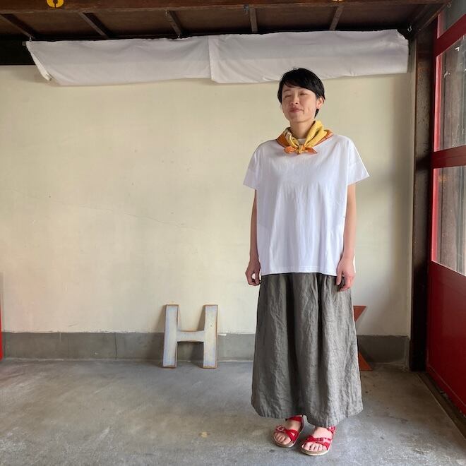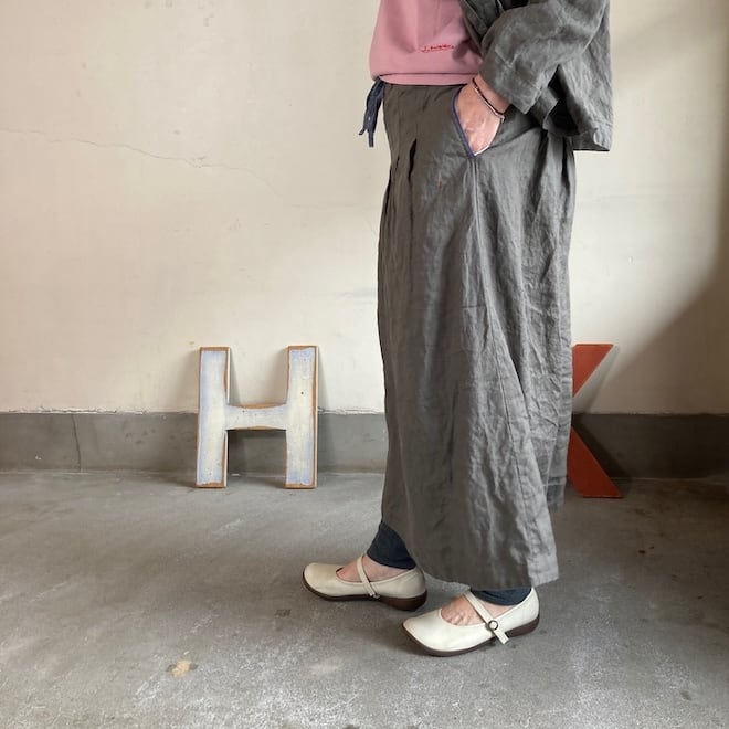 非常に暑くて長かった2023年の夏、いつもなら秋服を着る時期なのにまだまだ夏服を着る、残暑の時期の服の選びにくさが目立ったような印象がありました。当店でもその傾向に対する新たな提案を模索していたところでしたが、快晴堂さんは6月末あたり発売のジャパンリネンの色味をやや落ち着いたものにすることで涼しい素材であるけれど、秋にも着やすい色味で仕上げるという作品を発売してくれました。