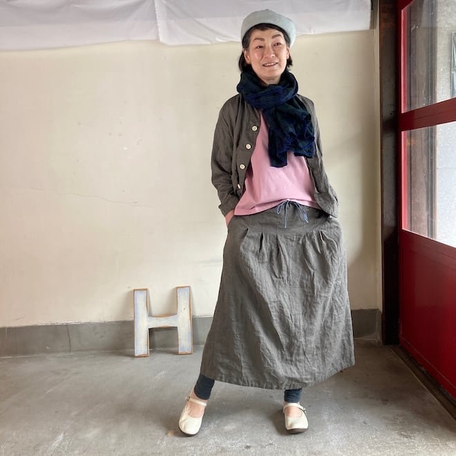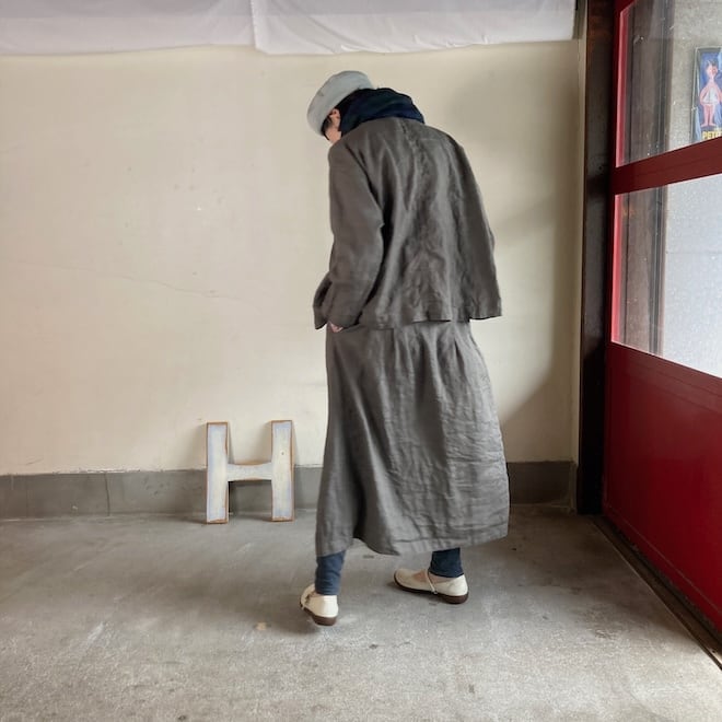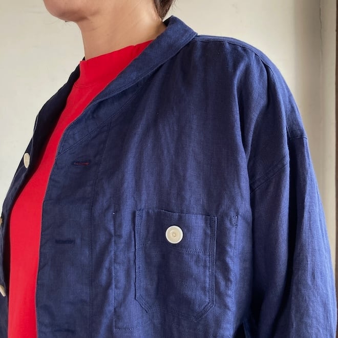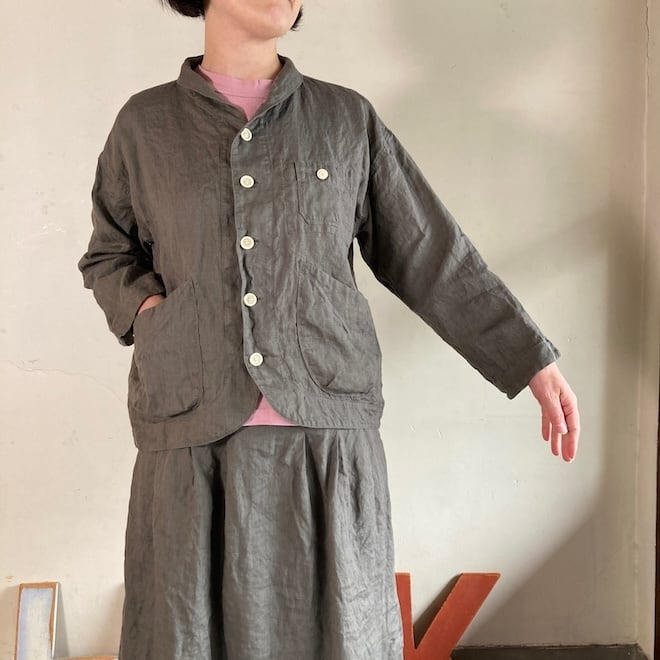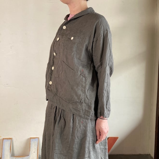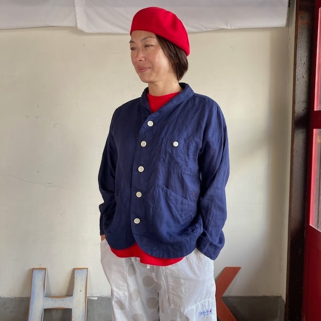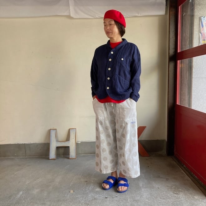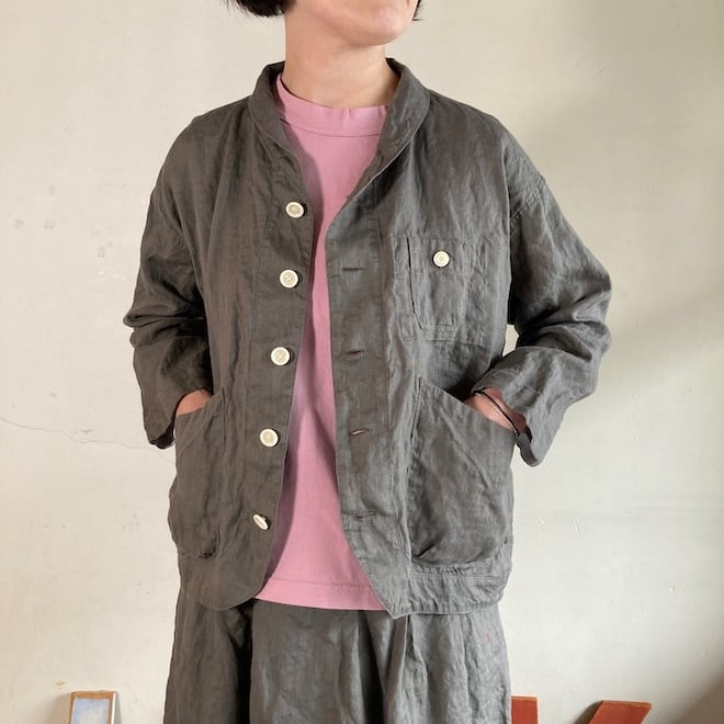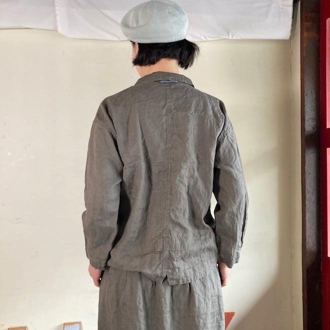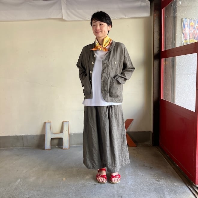 当店では同生地の4ポケットイージーパンツやタックスカートとのセットアップを意識して、セレクトいたしましたが、カーディガン代わりにさらっと羽織ったり、涼しく着られるのに少ししっかり感もあって、単品でも重宝しそうな作品です。