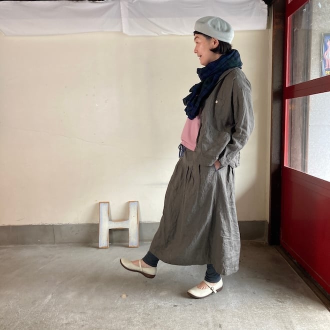 非常に暑くて長かった2023年の夏、いつもなら秋服を着る時期なのにまだまだ夏服を着る、残暑の時期の服の選びにくさが目立ったような印象がありました。当店でもその傾向に対する新たな提案を模索していたところでしたが、快晴堂さんは6月末あたり発売のジャパンリネンの色味をやや落ち着いたものにすることで涼しい素材であるけれど、秋にも着やすい色味で仕上げるという作品を発売してくれました。