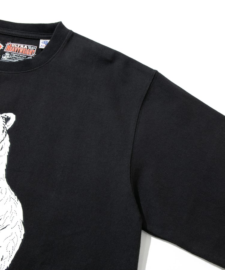 10oz以上の超ヘビーウェイトなオリジナル生地を使用。双糸で編み上げることで、はっきりと糸目が見え、綺麗な目面に。USAコットンらしいシャリ感もあり通常のTシャツ生地より2.5倍~3倍の強度がある丈夫な生地。Tシャツとスウェットの中間くらいのイメージで幅広い季節に対応。